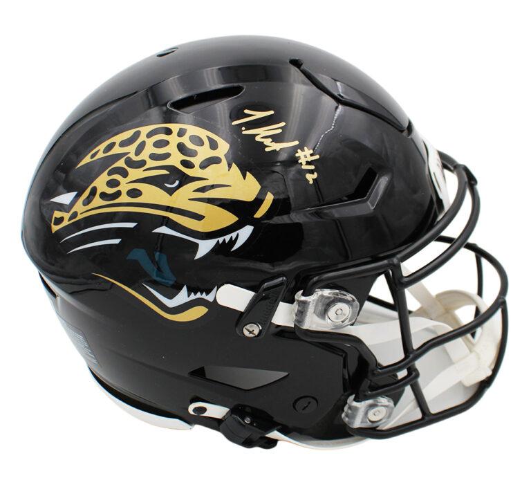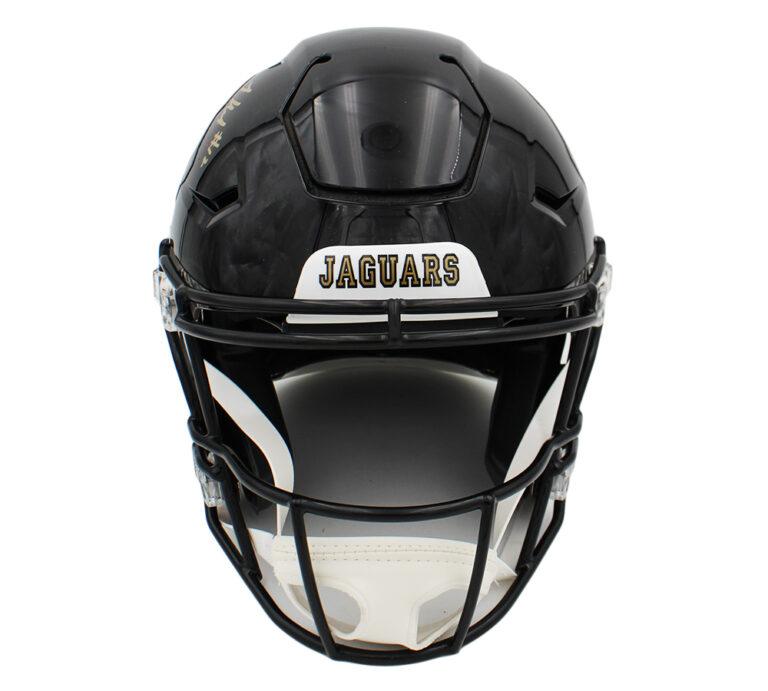 Riddell Jacksonville Jaguars full-size authentic on-field throwback alternate speedflex helmet. Hand-signed by Travis Hunter.