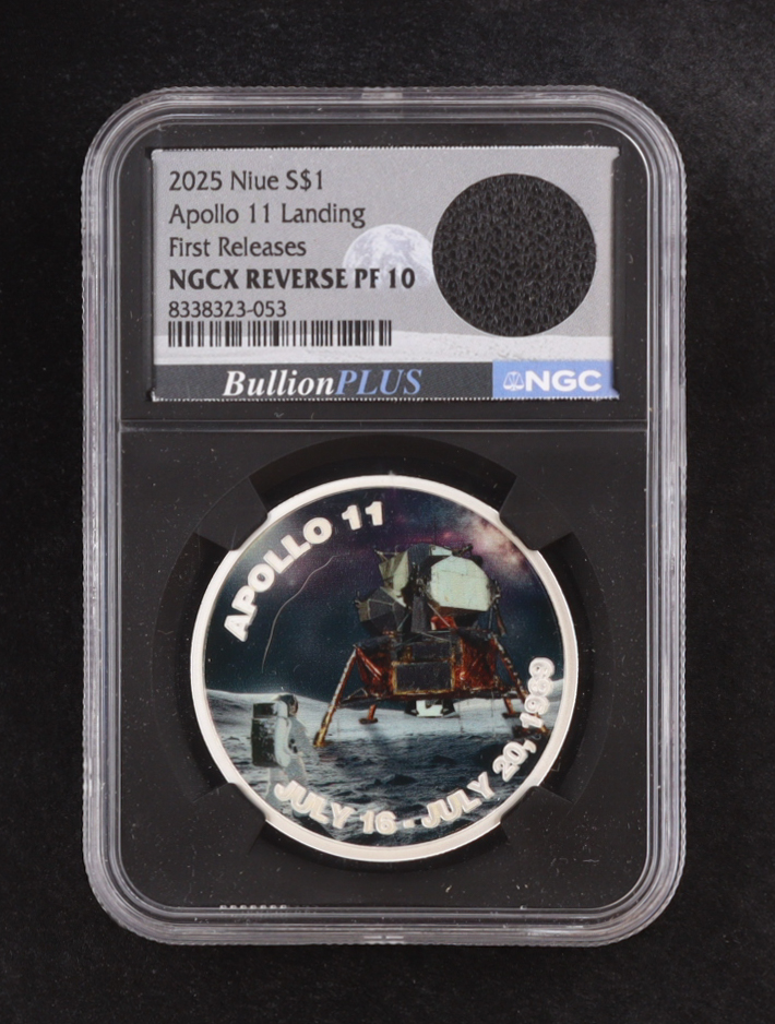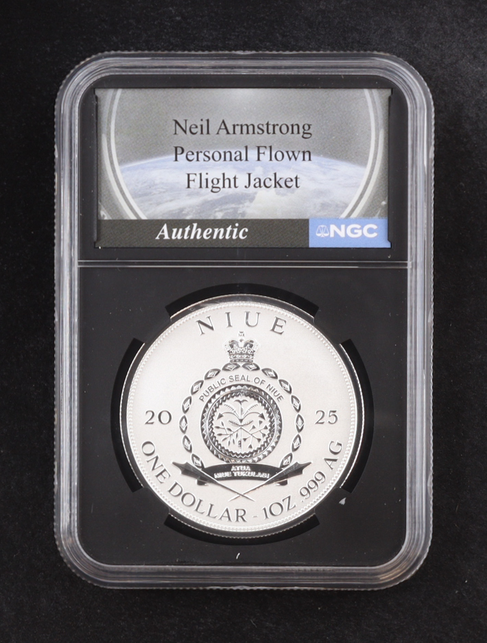 2025 Niue $1 Apollo 11 Landing, First Releases - Neil Armstrong Personal Flown Flight Jacket Relic (NGCX Reverse PROOF 10)