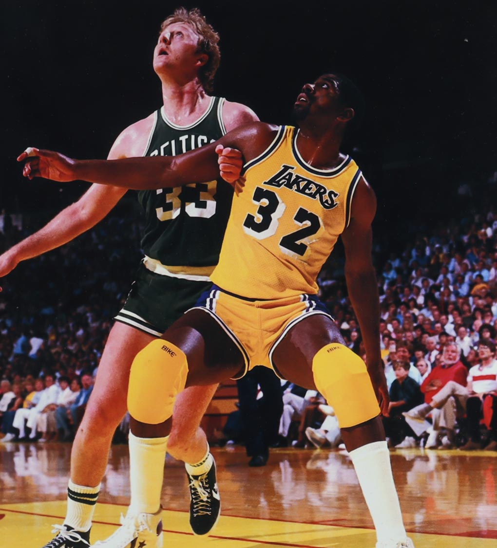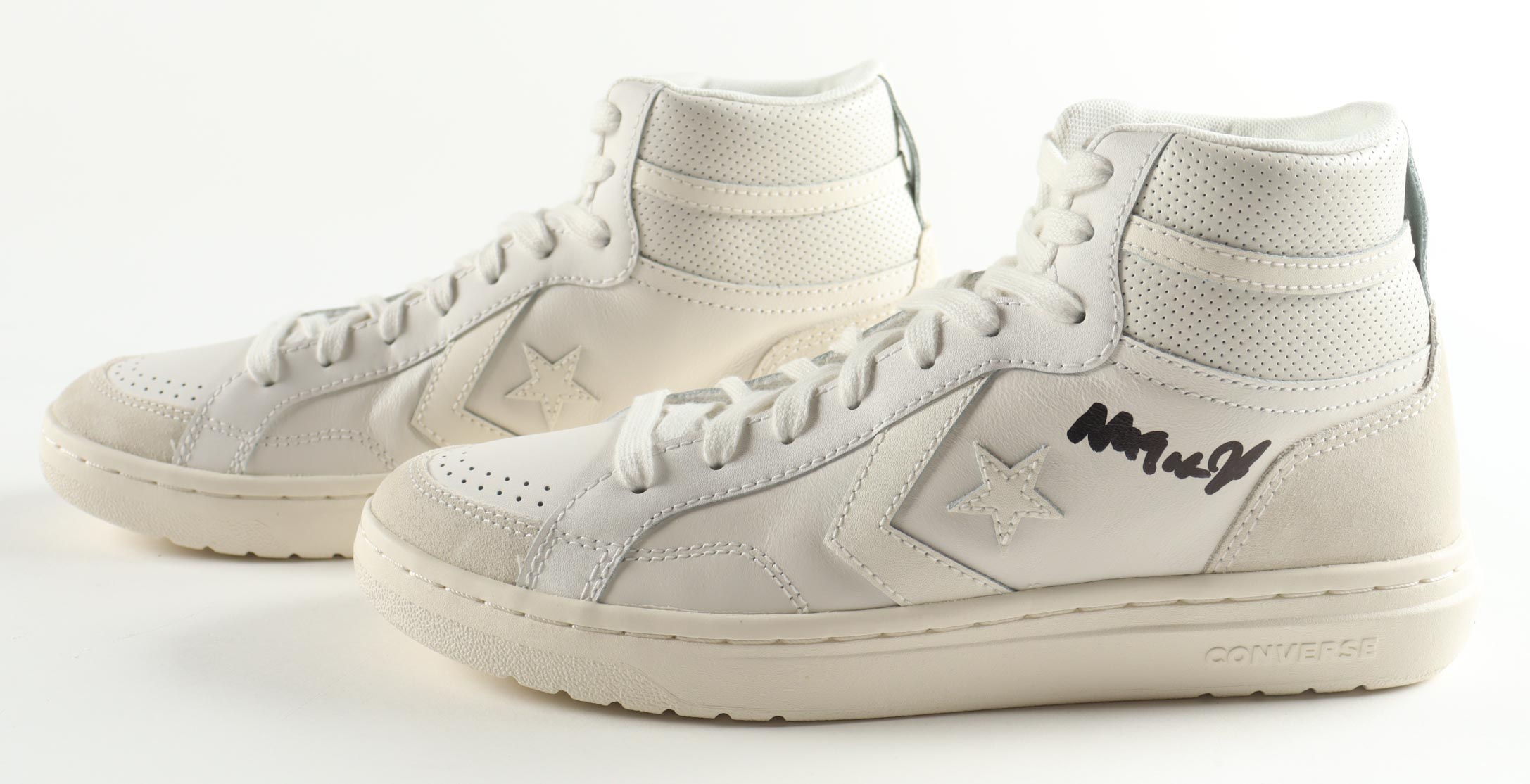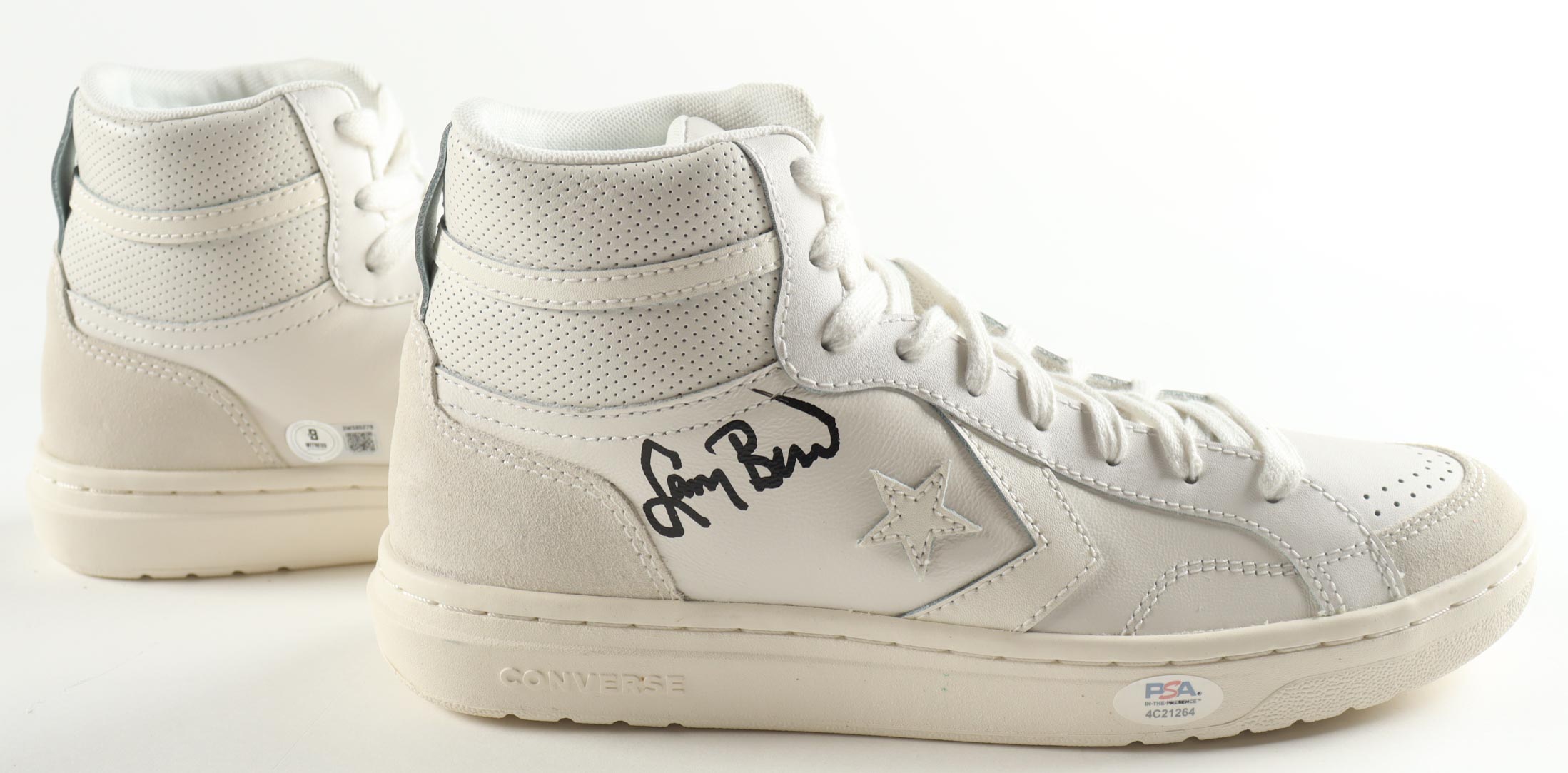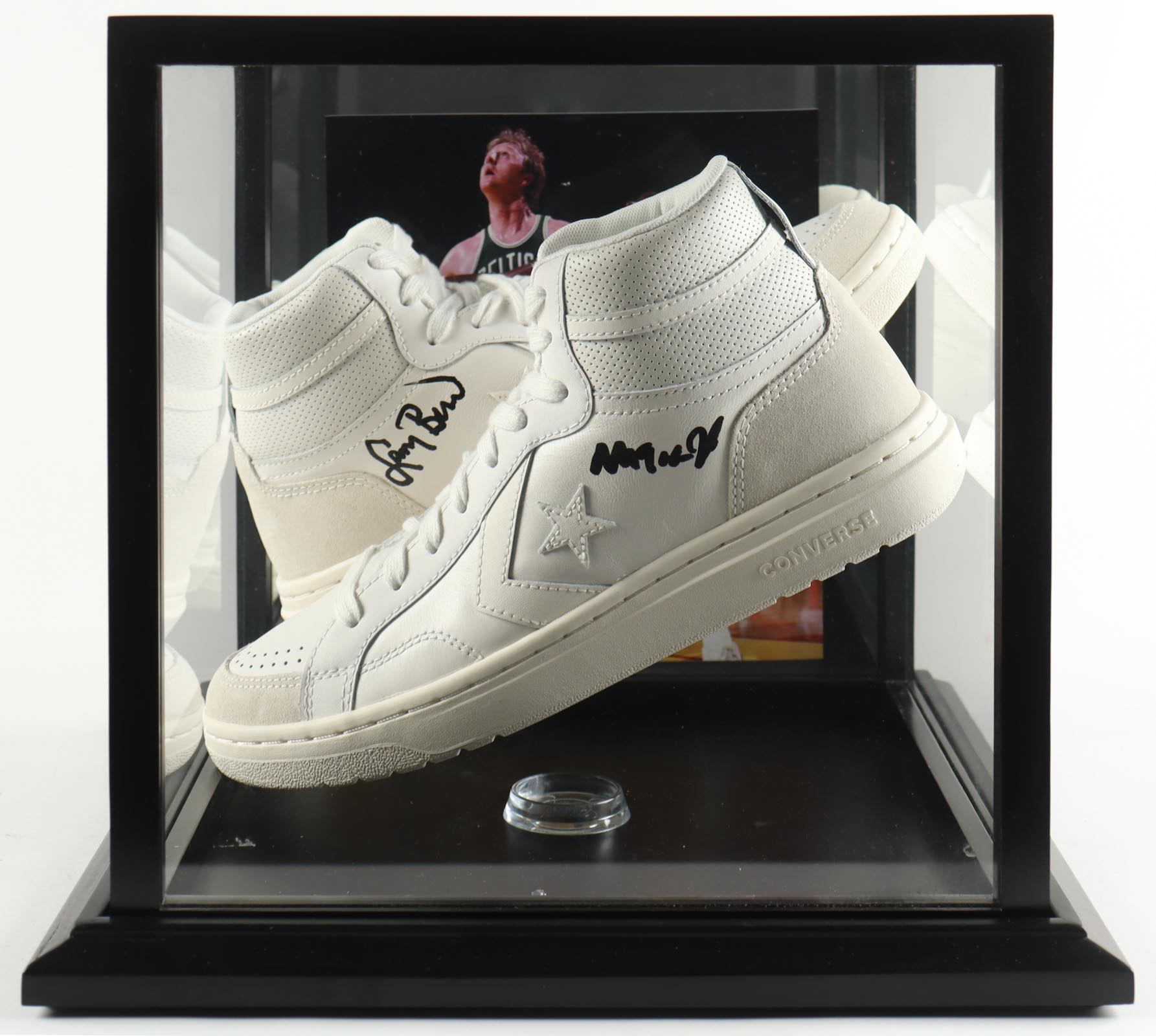 Pair of (2) Converse All Star Weapon White Leather Basketball Shoes, size 9. Hand-signed by Magic Johnson (Los Angeles Lakers, HOF) and Larry Bird (Boston Celtics, HOF). The display case is included as shown.