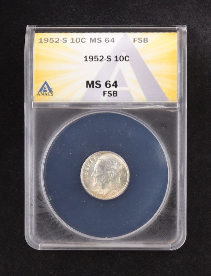 1952-S Roosevelt Silver 10C Dime, Full Split Bands (ANACS MS64 FSB)