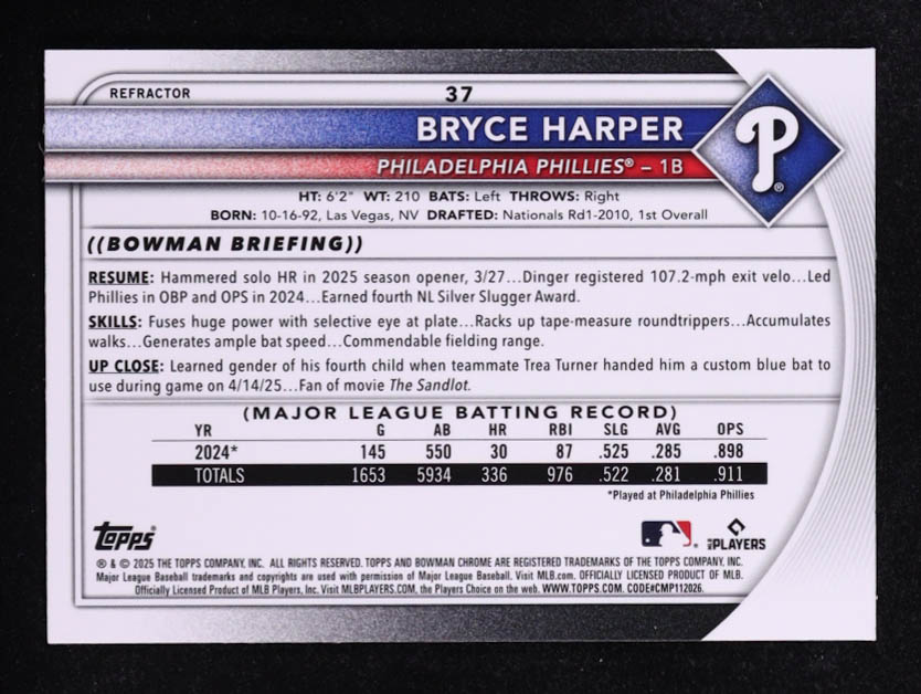 Bryce Harper 2025 Topps Bowman Chrome Refractor #37 #493/499