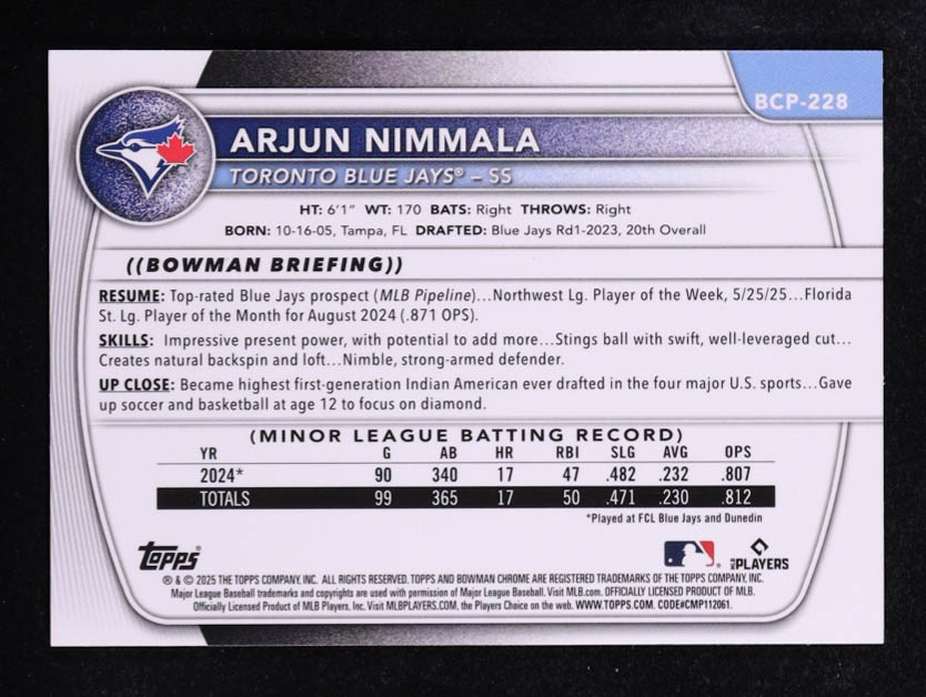Arjun Nimmala 2025 Bowman Chrome Prospects Yellow Geometric Refractor #BCP-228 RC #22/75