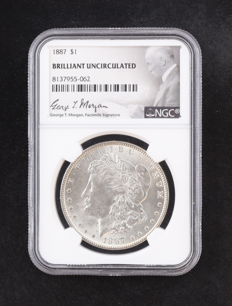 1887 Morgan Silver $1 Dollar - George T. Morgan Signature Label (NGC BRILLIANT UNCIRCULATED)