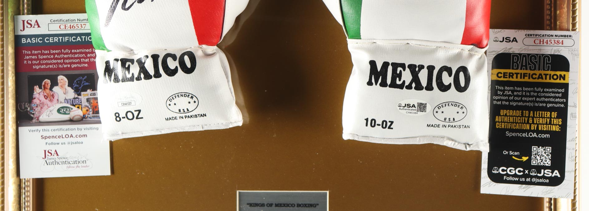Julio Cessar Chavez, Marco Antonio Barrera & Erik Morales Signed Custom Framed Set of (2) Mexico Professional Boxing Gloves (JSA)