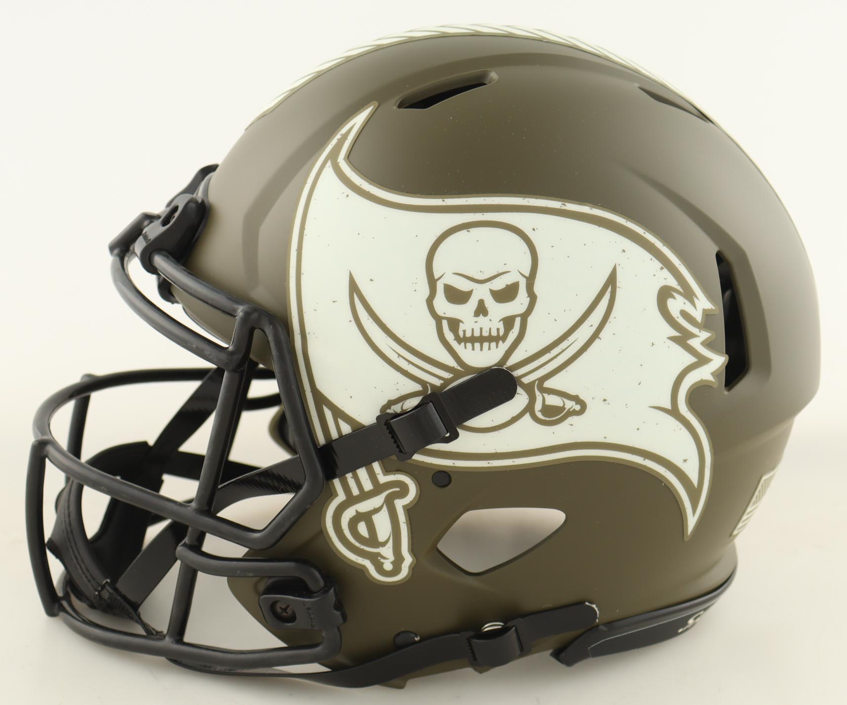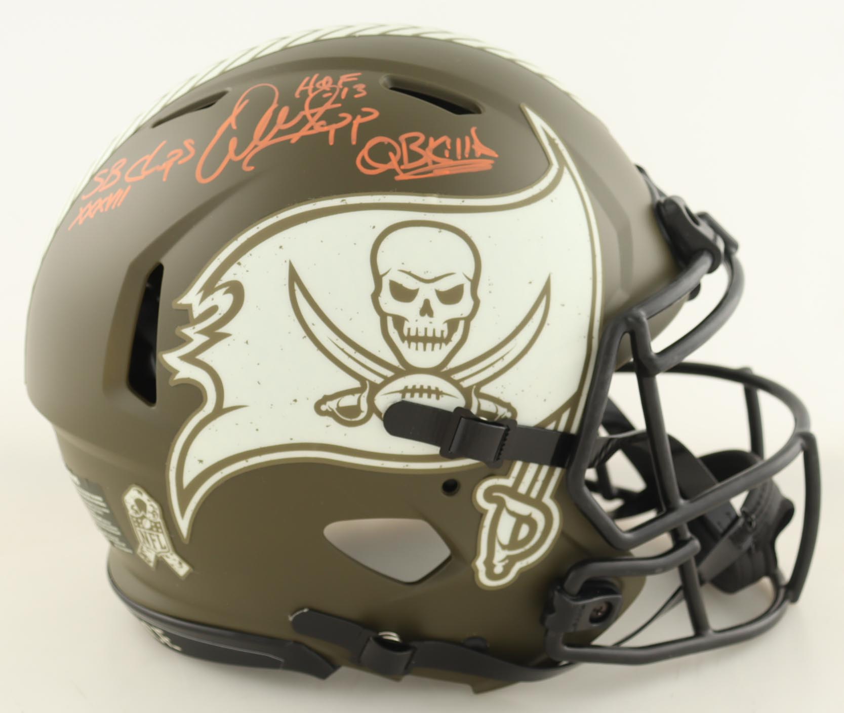 Riddell Tampa Bay Buccaneers full-size authentic on-field Salute to Service Alternate Speed helmet. Hand-signed and inscribed by Warren Sapp (HOF).