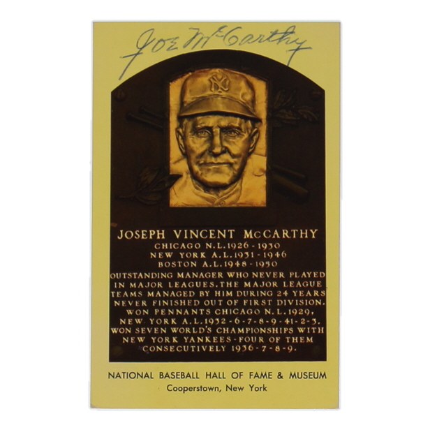 Joe McCarthy Signed Hall Of Fame Plaque Postcard (PSA)