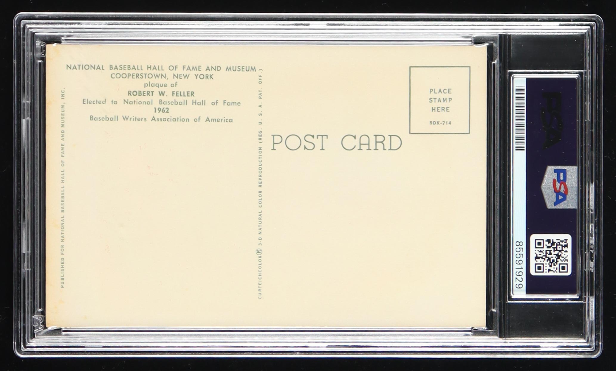 Bob Feller Signed Cut on Hall of Fame Plaque Postcard (PSA)