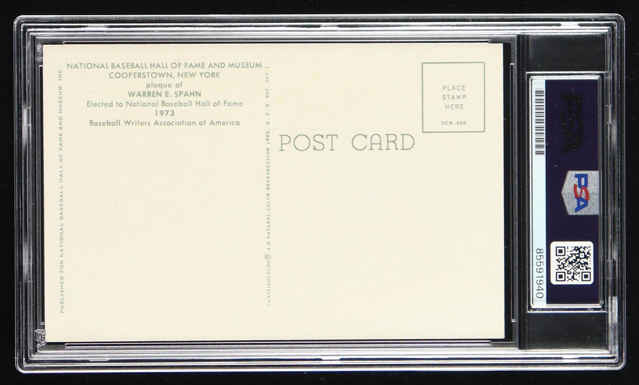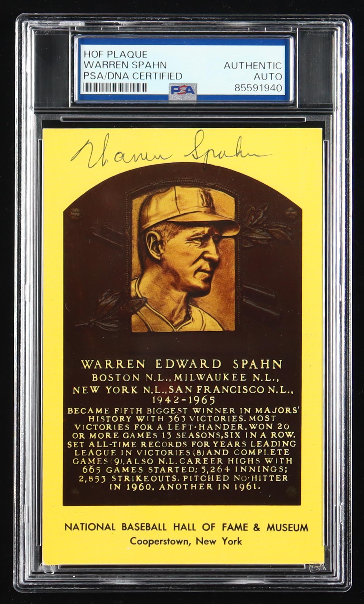Warren Spahn Signed Cut on Hall of Fame Plaque Postcard (PSA)