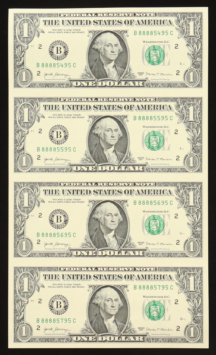 Uncut Sheet of (4) 2017 $1 Federal Reserve Notes