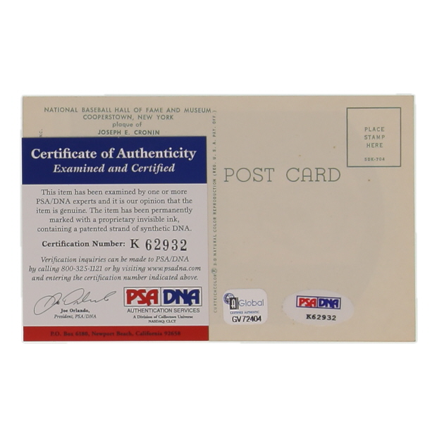 Joe Cronin Signed Hall Of Fame Plaque Postcard (PSA)
