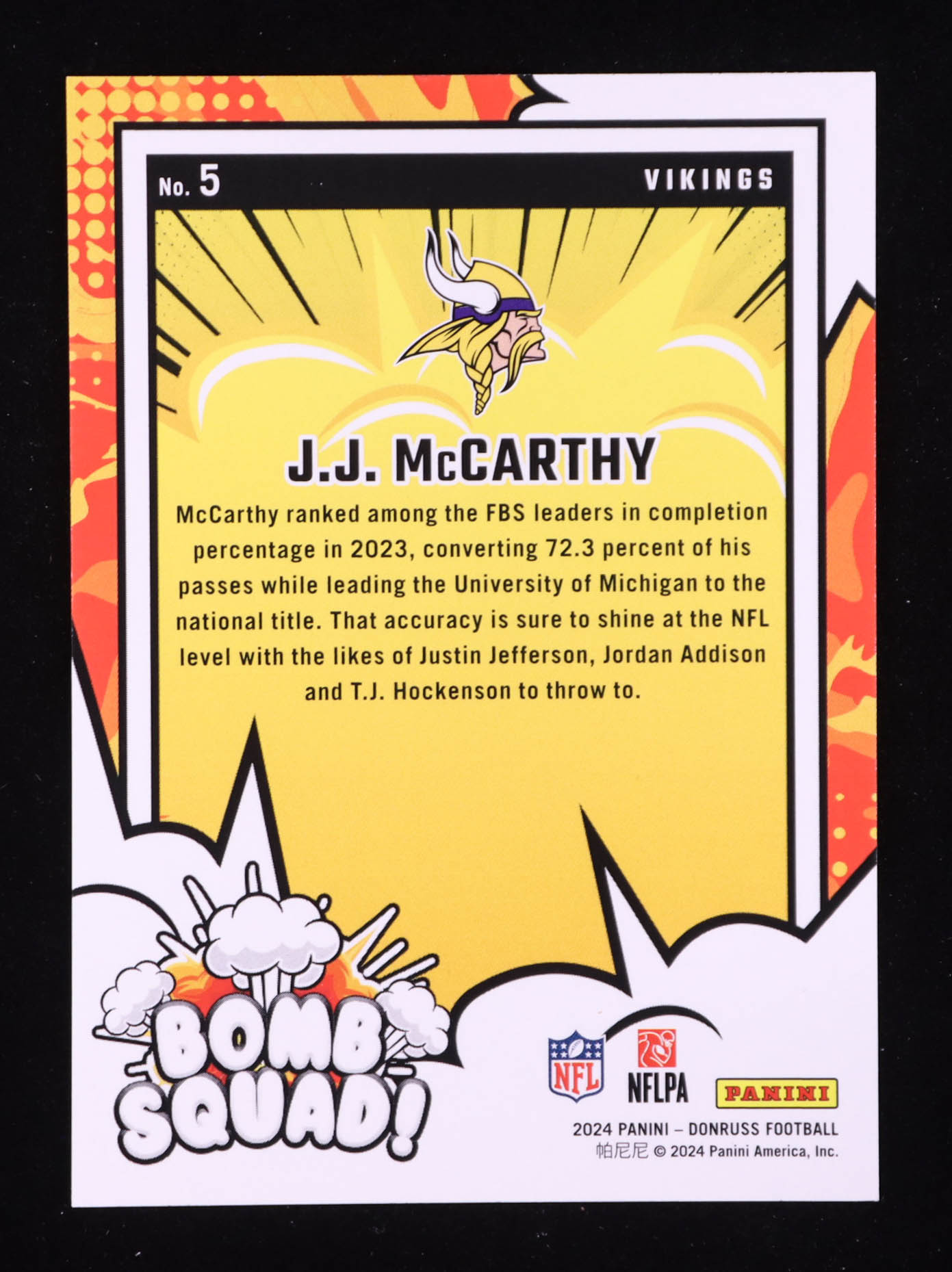 J.J. McCarthy 2024 Donruss Bomb Squad #5 RC