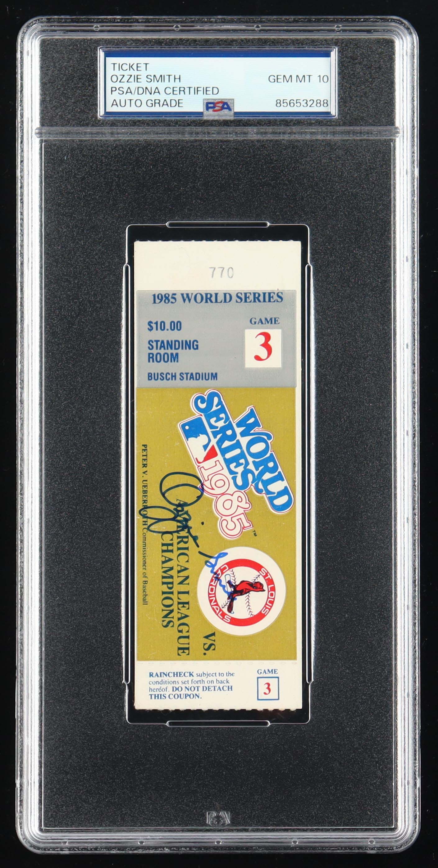 1985 World Series Game ticket has been hand-signed by Ozzie Smith (St. Louis Cardinals, HOF) and graded (PSA 10). Please see photos for details regarding the item.