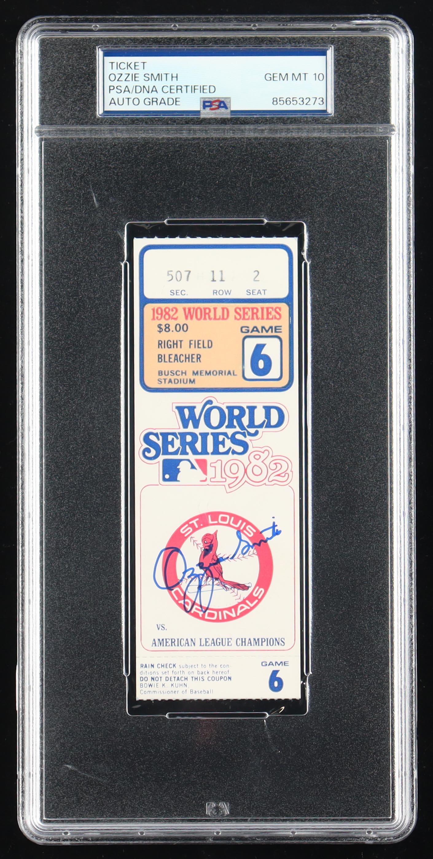 1982 World Series Game ticket has been hand-signed by Ozzie Smith (St. Louis Cardinals, HOF) and graded (PSA 10). Please see photos for details regarding the item.