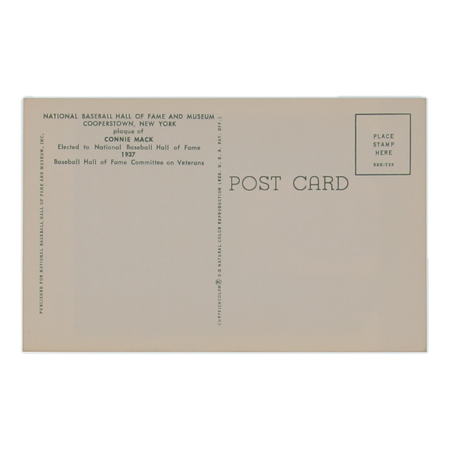 National Baseball Hall Of Fame Postcard features a cut that has been hand-signed by Connie Mack (D. 1956, Philadelphia Athletics, HOF).