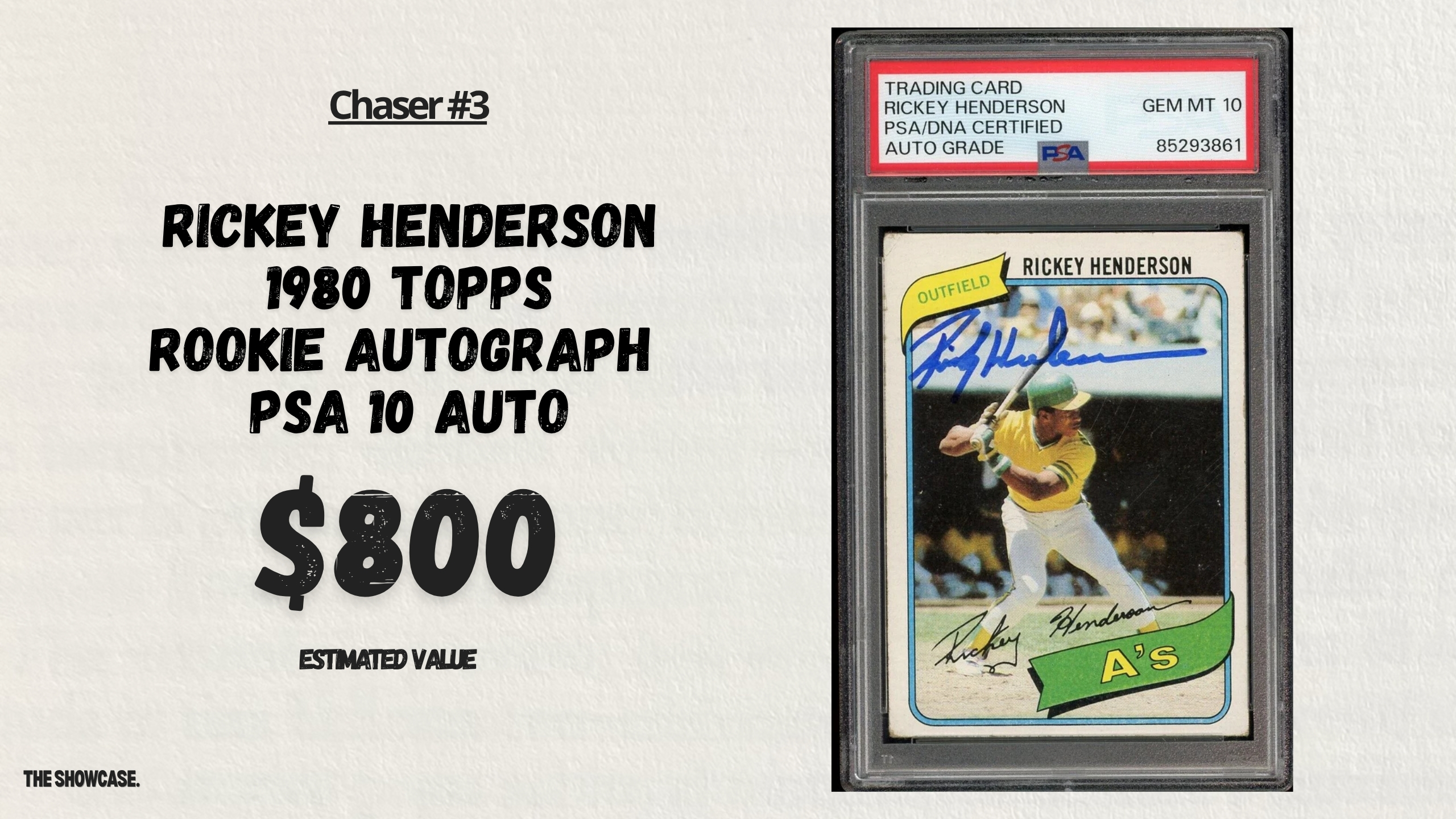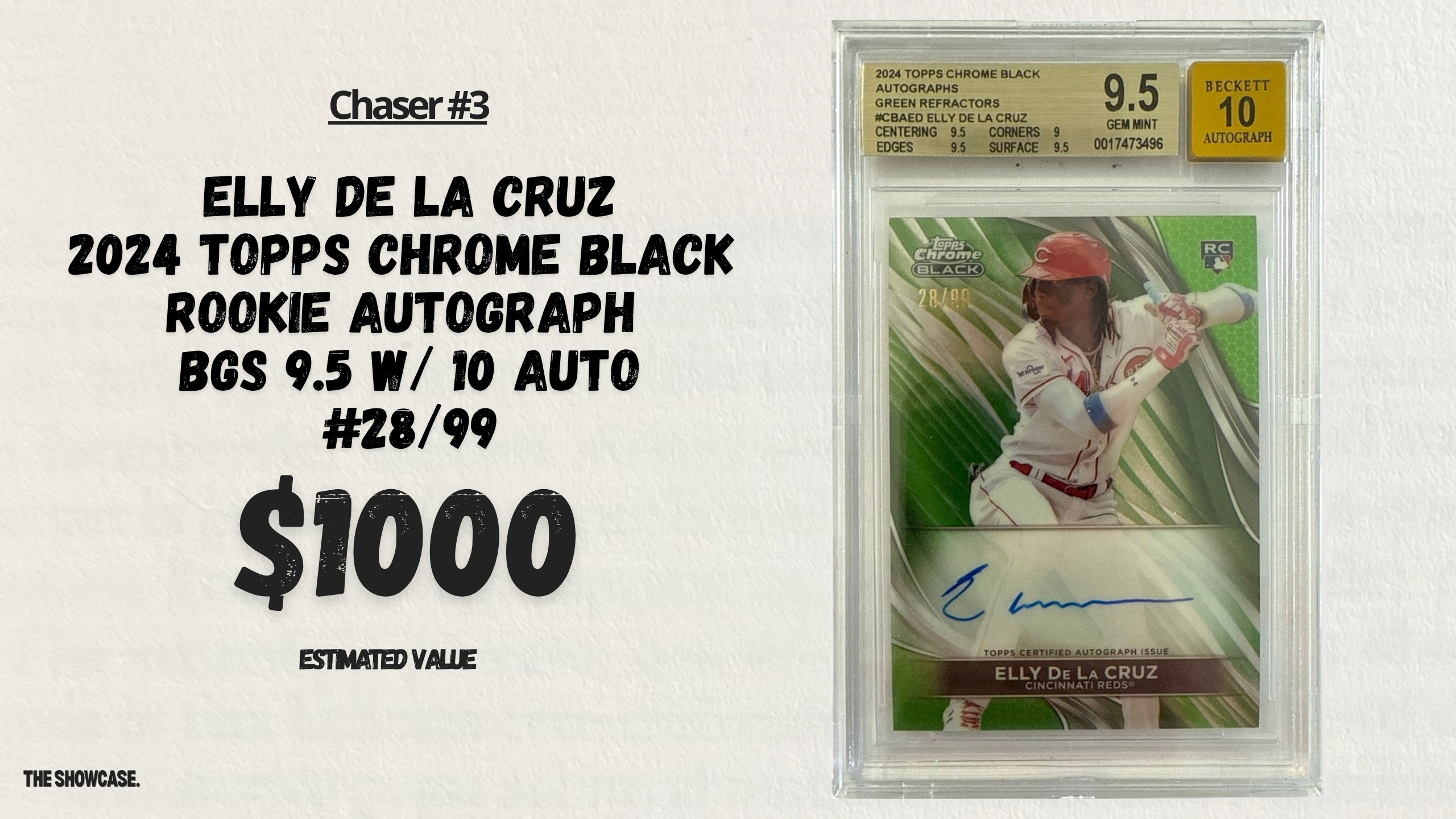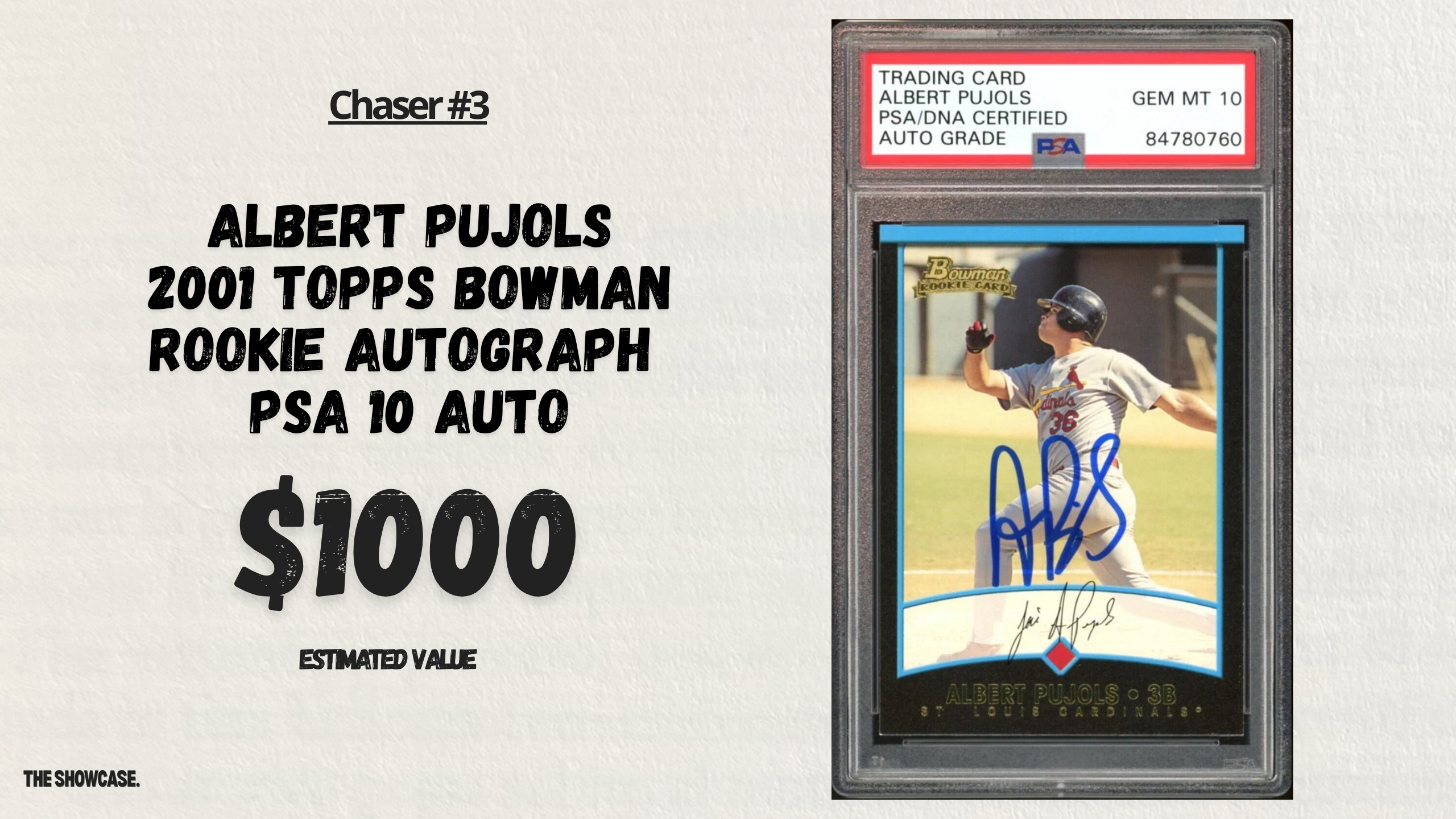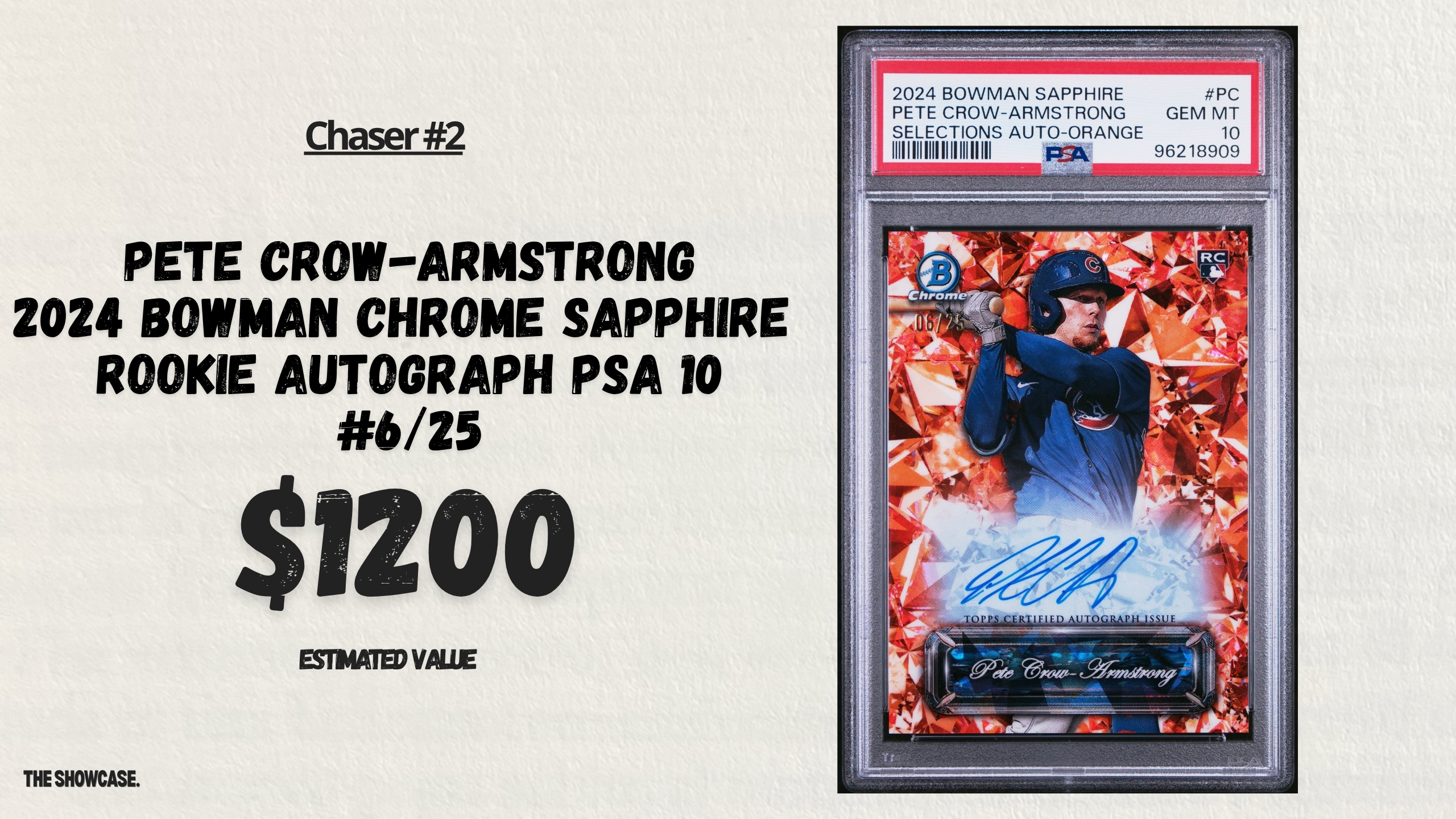 • Pete Crow-Armstrong 2024 Bowman Chrome Sapphire Auto Orange Rookie /25 PSA 10 – $1,200 Value • Elly De La Cruz 2024 Topps Chrome Black Prizm Auto Green Rookie /99 BGS 9.5/10 - $1,000 Value • Albert Pujols 2001 Topps Bowman Autograph Rookie PSA 10 Auto - $1,000 Value • Rickey Henderson 1980 Topps Autograph Rookie PSA 10 Auto - $800 Value