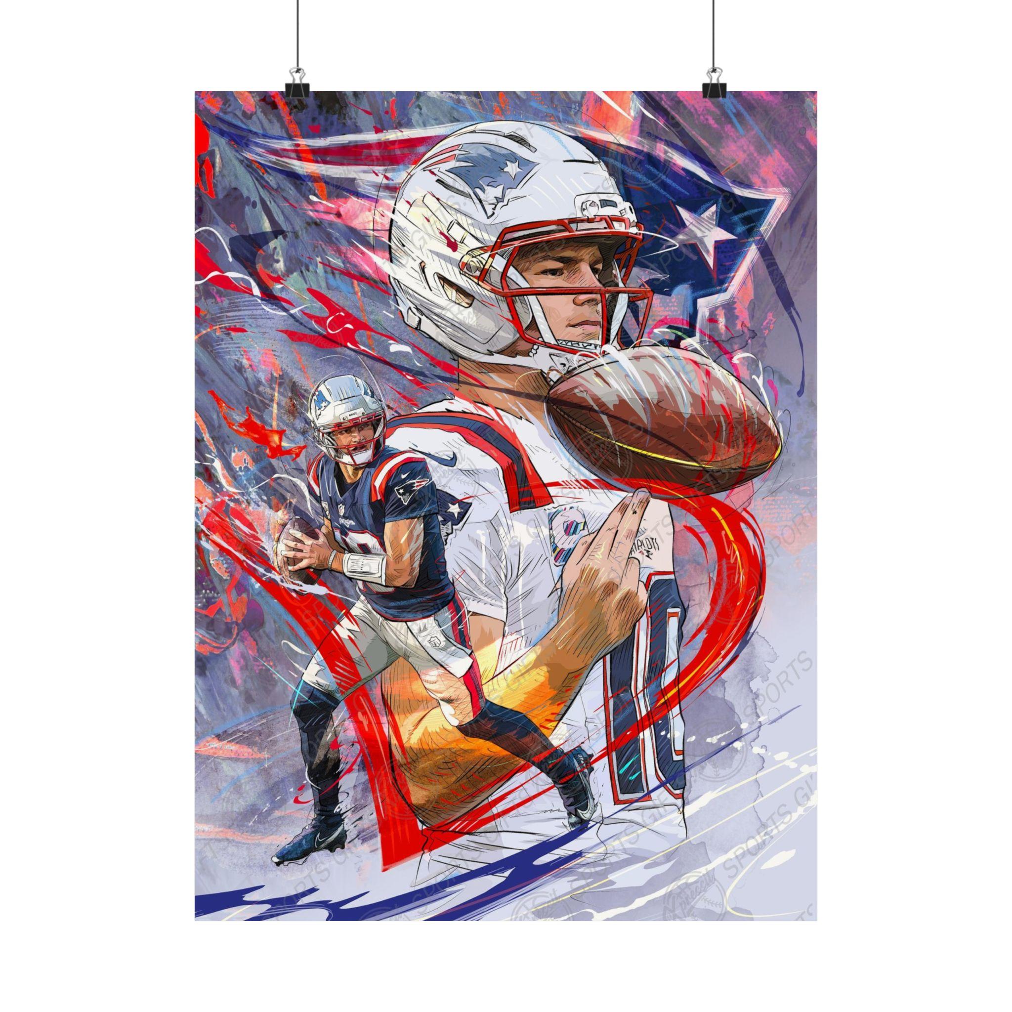Poster measures 36" x 24" in size and features Drake Maye (New England Patriots). Please note, this item is unsigned. Authentic, one-of-a-kind Sports Wall Artwork poster is printed on museum grade fine art paper paper.