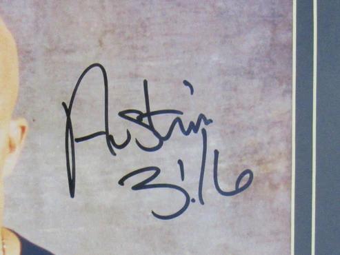 Custom frame measures 14” x 18” in size and features a photo that has been hand-signed by "Stone Cold" Steve Austin (HOF). Please note, the frame has minor scratches.