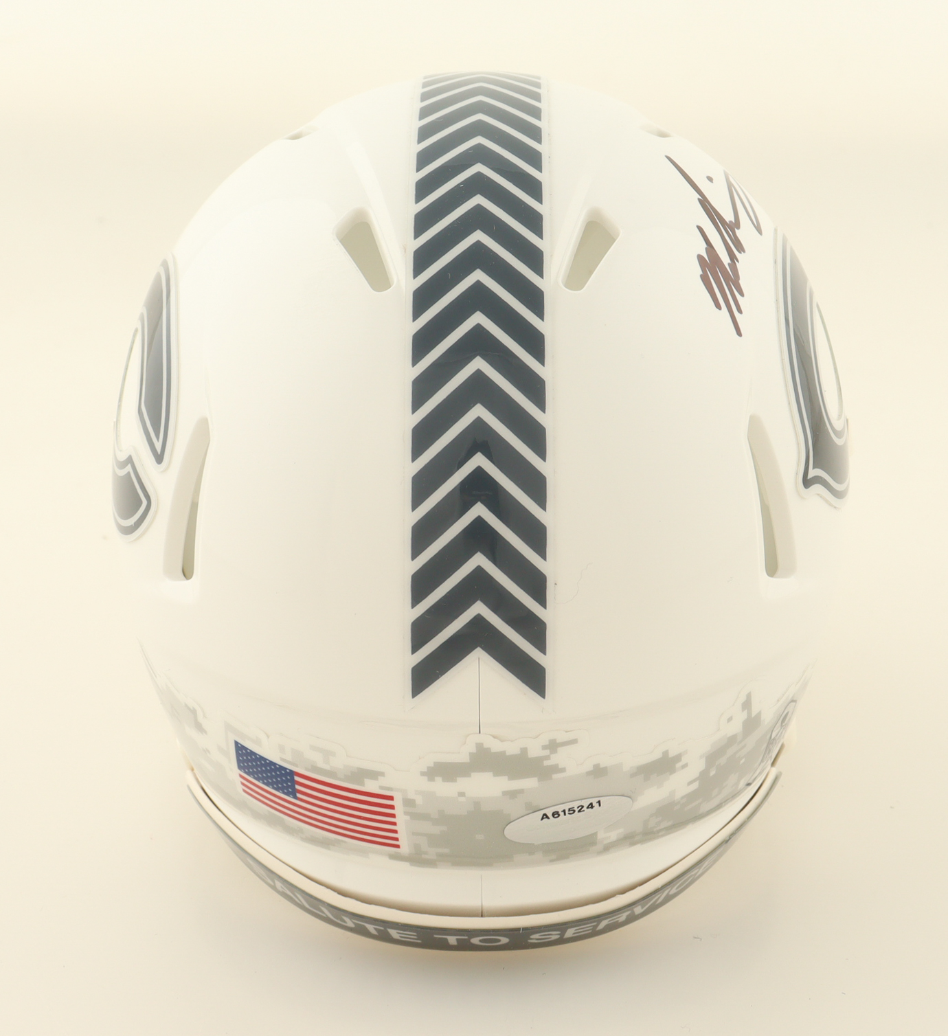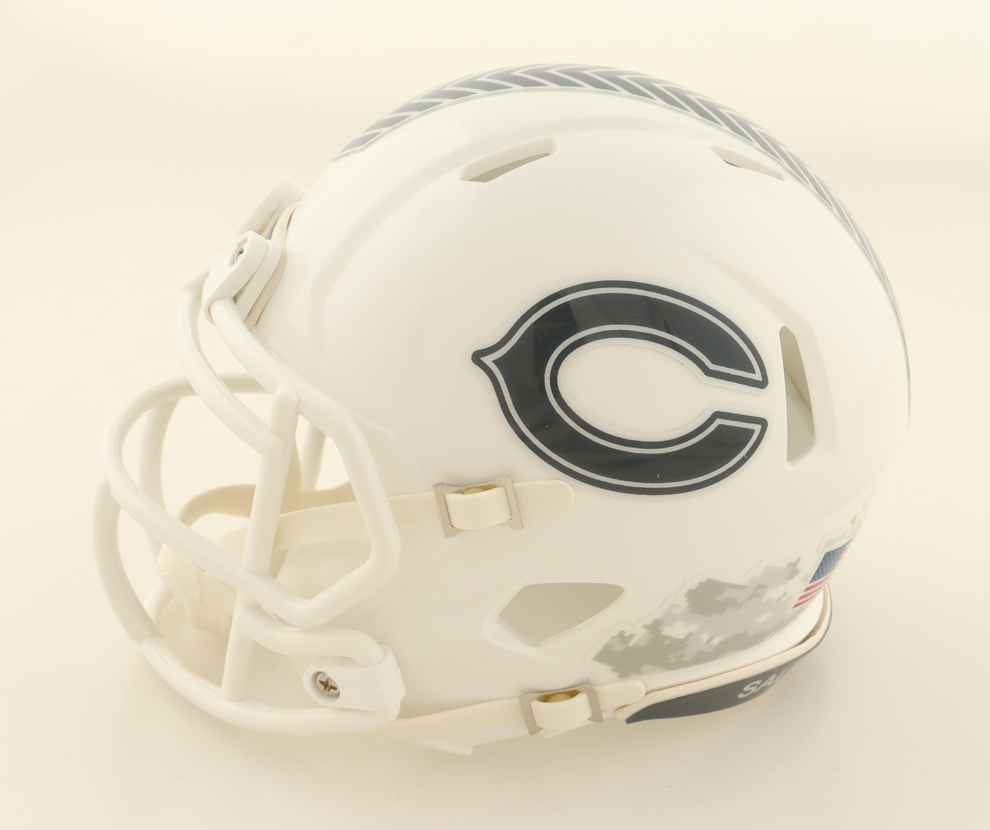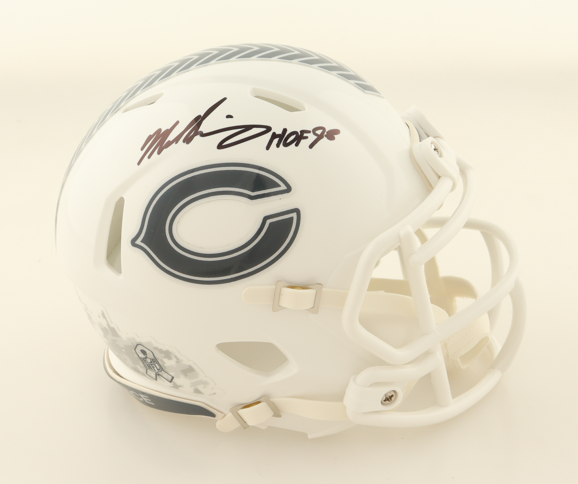 Riddell Chicago Bears Salute To Service Alternate Speed Mini helmet has been hand-signed and inscribed by Mike Singletary (HOF).