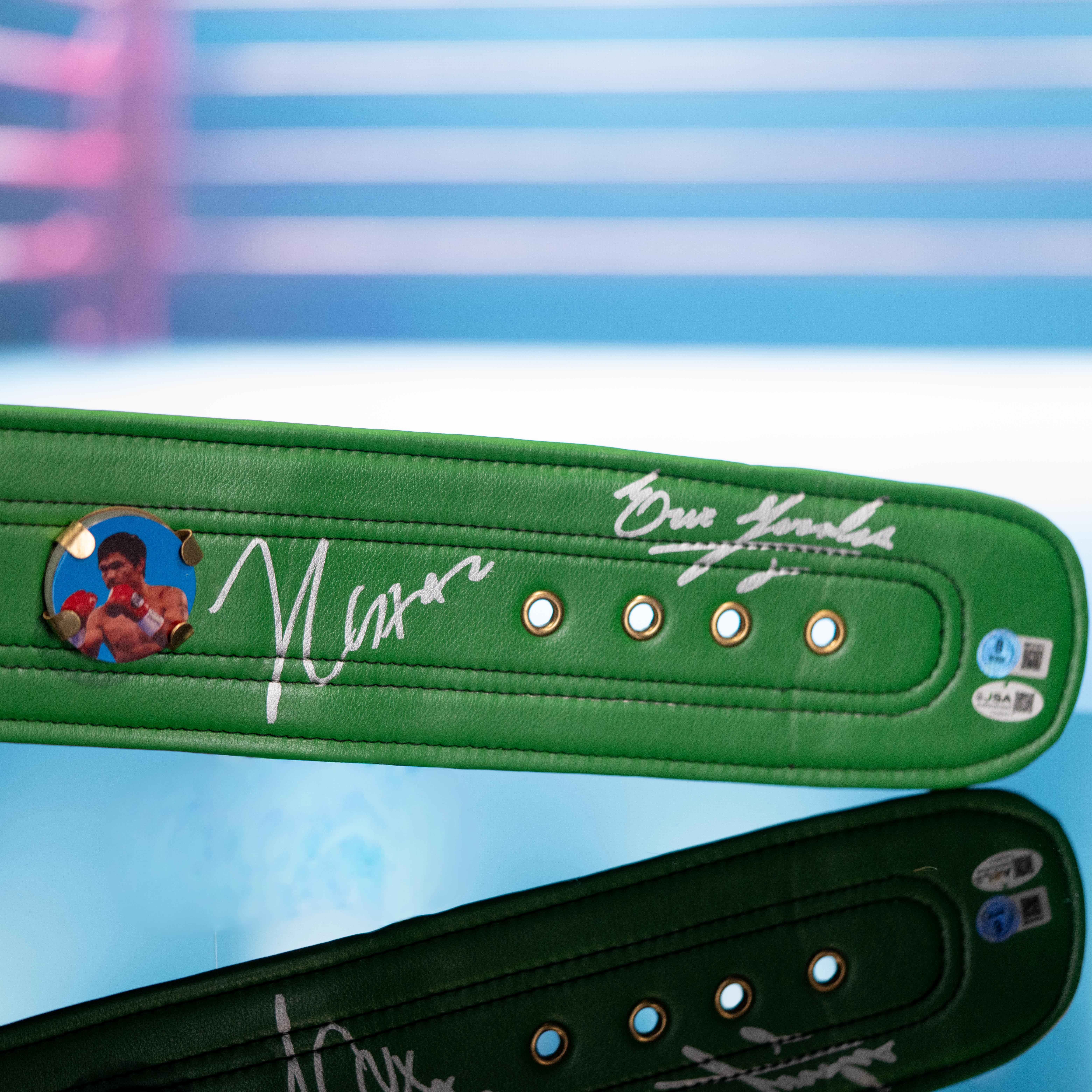 Full-Size WBC replica boxing championship belt measures approximately 48" in length. Hand-signed by (4) with Julio Cesar Chavez, Erik Morales, Marco Antonio Barrera, & Juan Manuel Marquez.