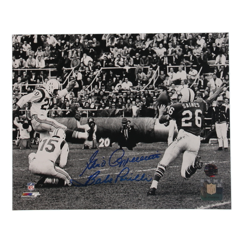 Photo measures 8" x 10" in size and has been hand-signed by Gino Cappelletti and Babe Parilli (New England Patriots).