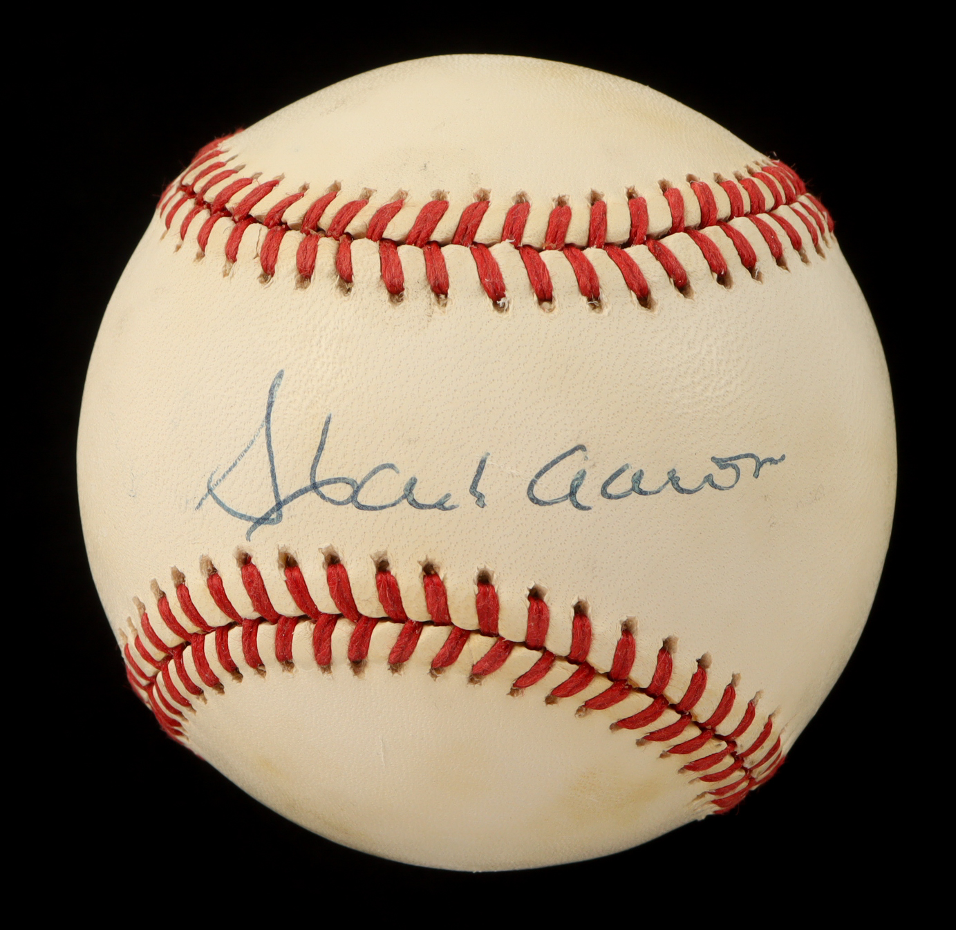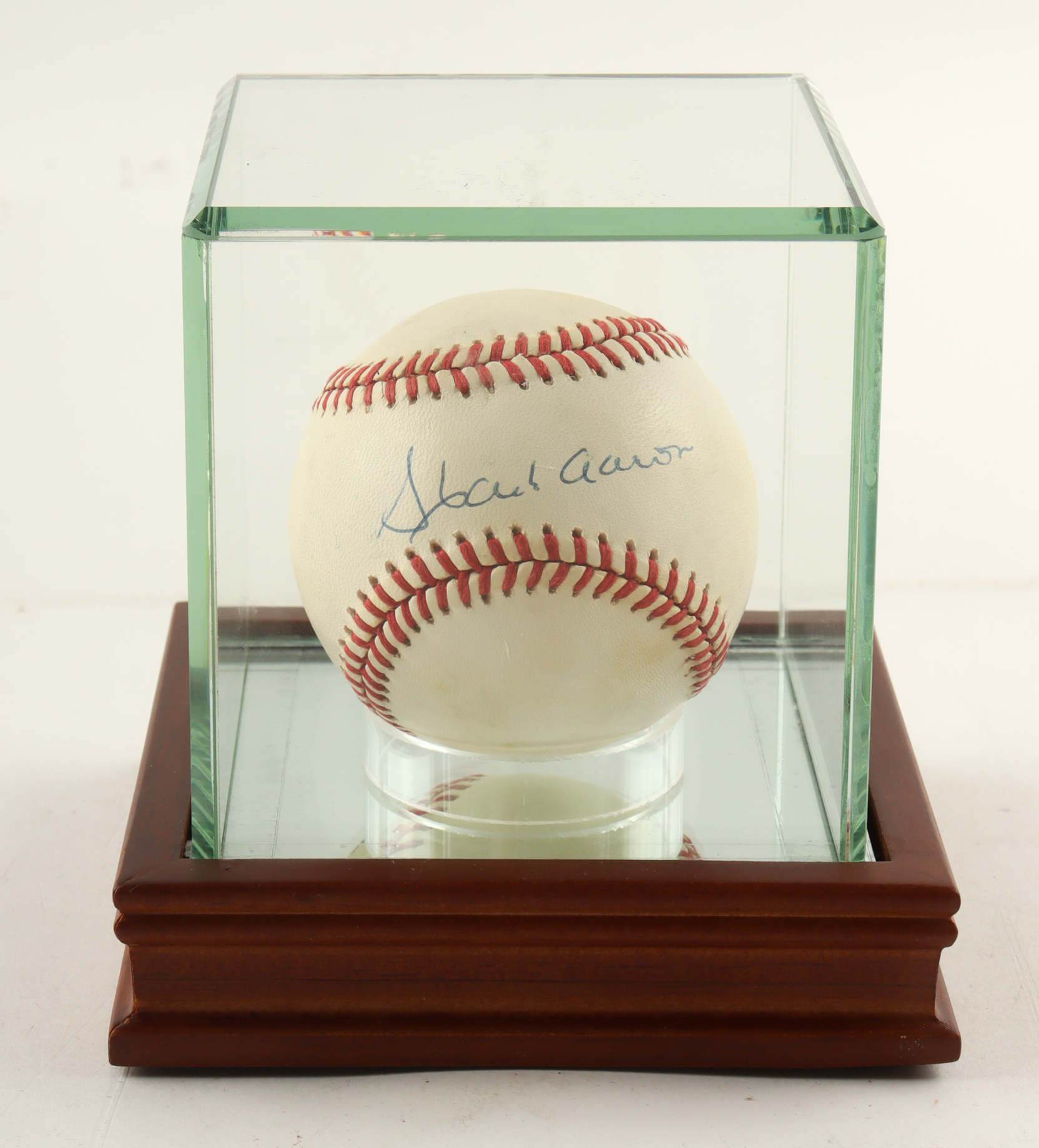Rawlings Official National League baseball. Hand-signed by Hank Aaron (D. 2021, Atlanta Braves, HOF). Note that the display case is included in the listing as shown above.