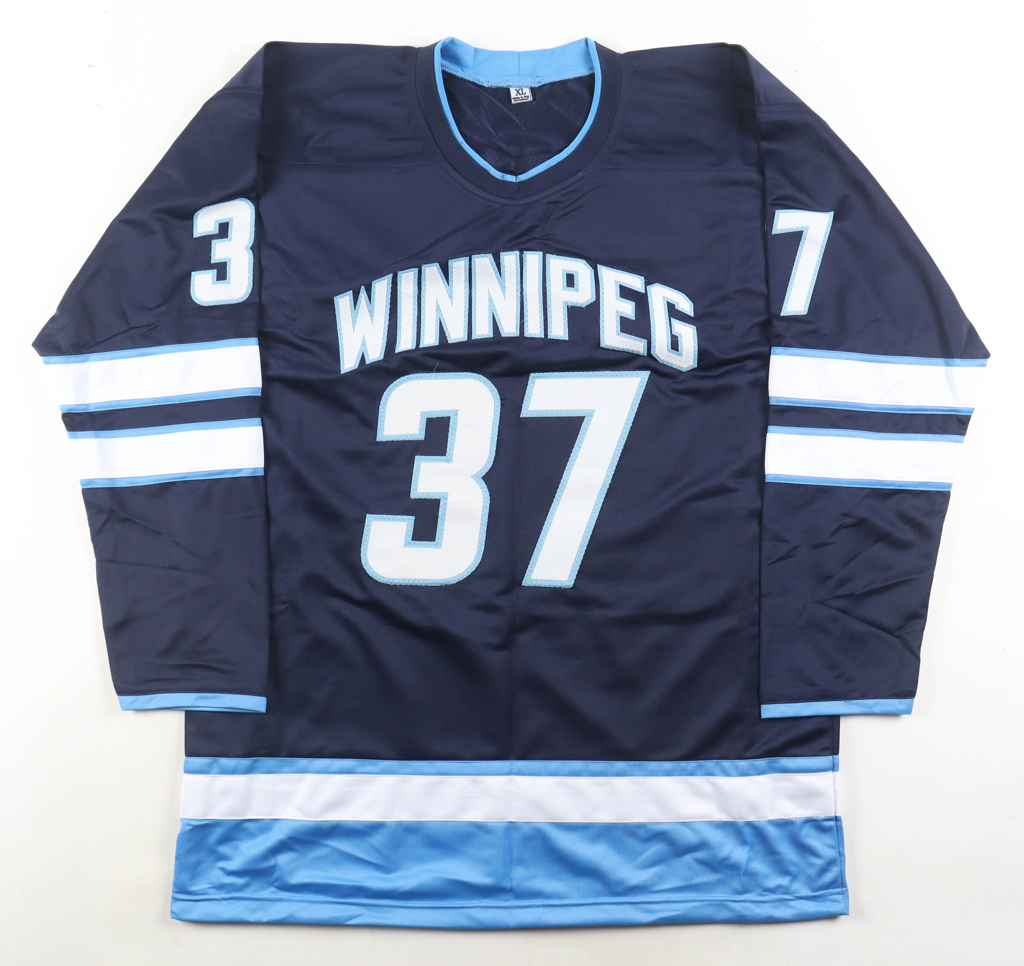 Custom jersey with everything sewn on, size XL. Hand-signed by Connor Hellebuyck.