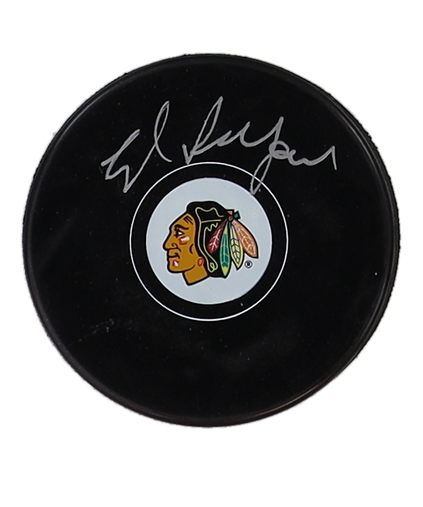 Chicago Blackhawks Logo Hockey Puck. Hand-signed by Ed Belfour (HOF).