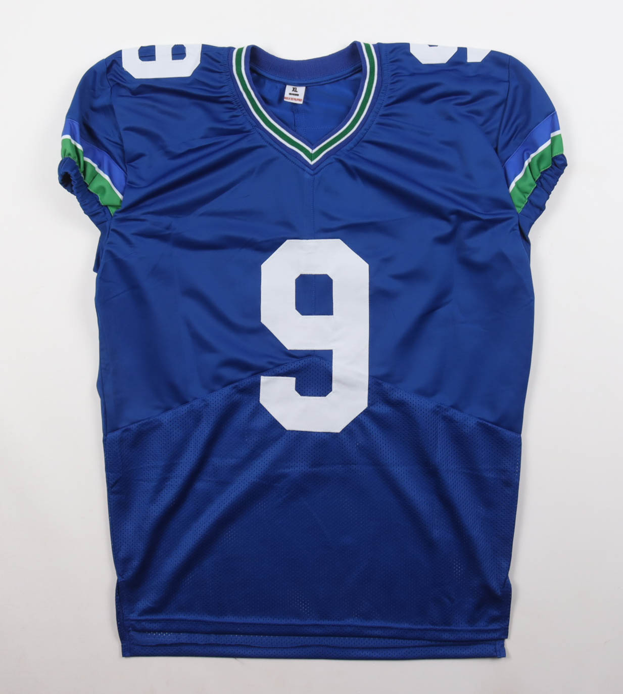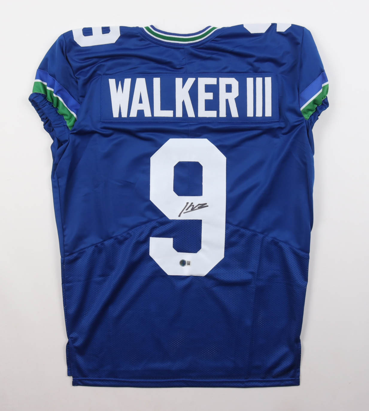 Custom jersey with everything sewn on, size XL. Hand-signed by Kenneth Walker III. Please note, glue is visible though the reverse number and a stain to the left of the signature. See photos regarding the condition of the item.