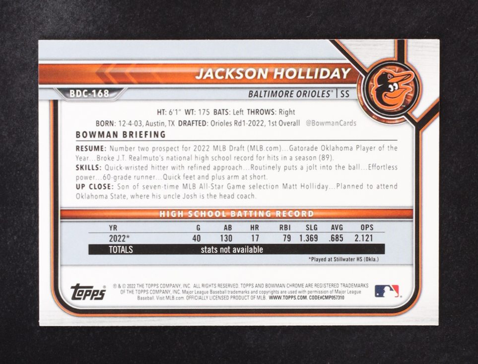Jackson Holliday 2022 Bowman Chrome Draft Sky Blue Refractors #BDC168 RC