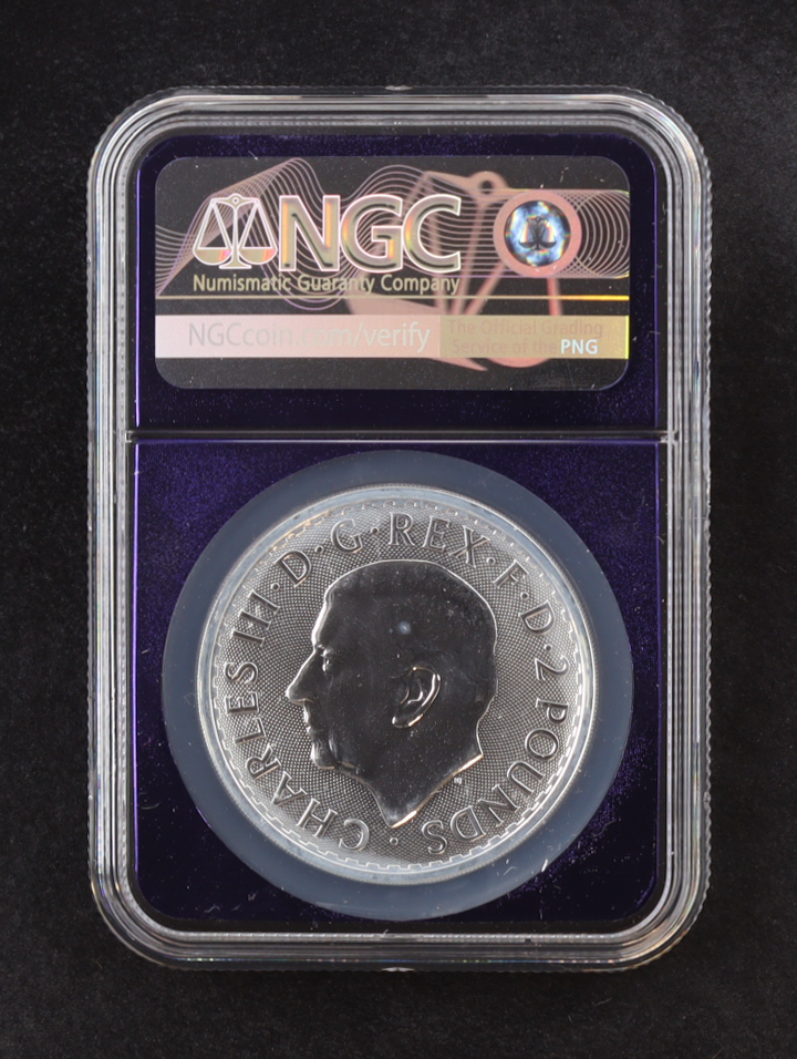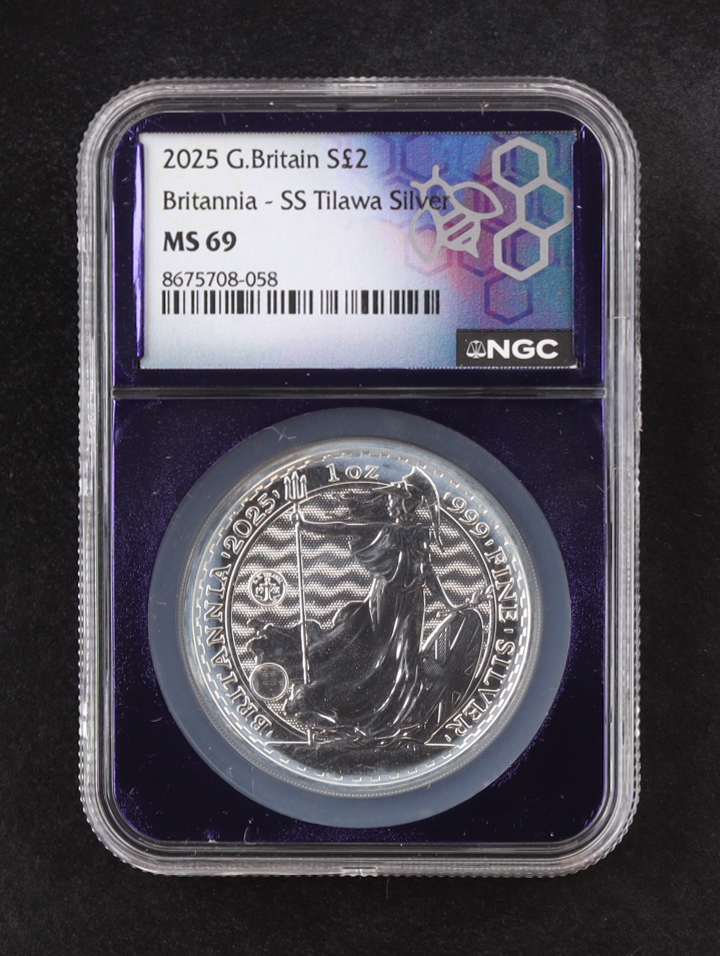 2025 G.Britain £2 Britannia, S.S. Tilawa Privy - Made from WWII Sunken S.S. Tilawa Recovered Silver - 1oz .999 Fine Silver (NGC MS69)