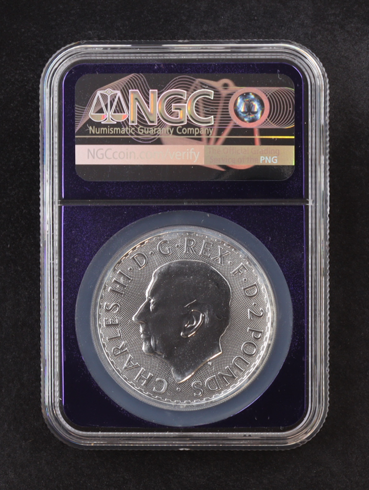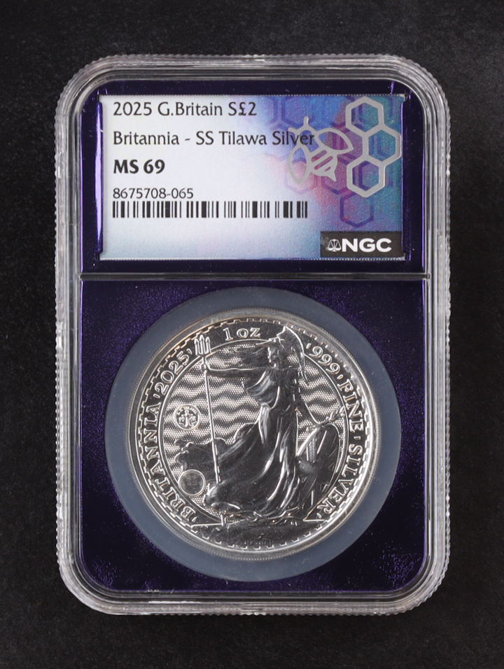 2025 G.Britain £2 Britannia, S.S. Tilawa Privy - Made from WWII Sunken S.S. Tilawa Recovered Silver - 1oz .999 Fine Silver (NGC MS69)