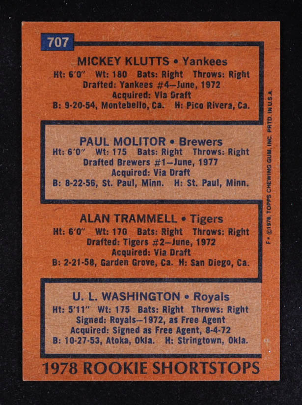 Mickey Klutts / Paul Molitor RC / Alan Trammell RC / U.L. Washington RC 1978 Topps Rookie Shortstops #707