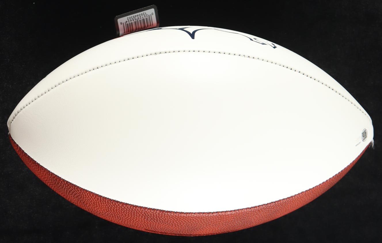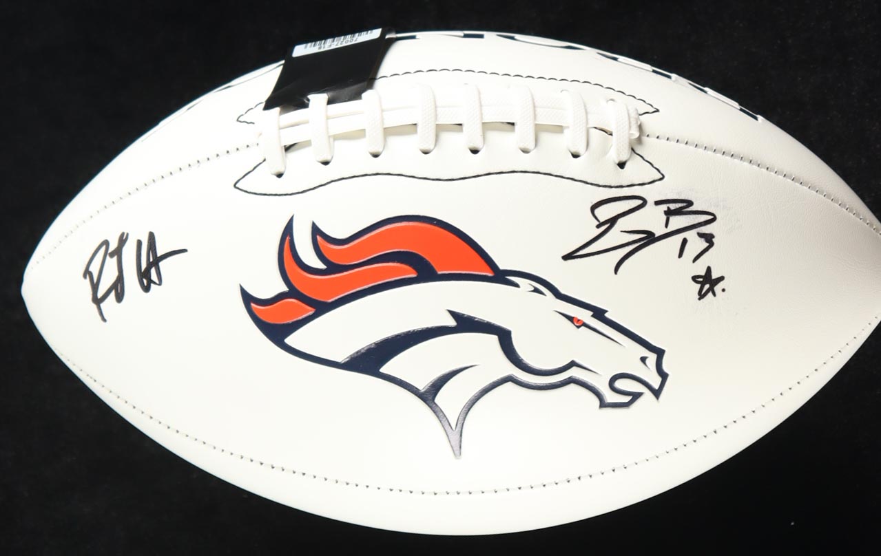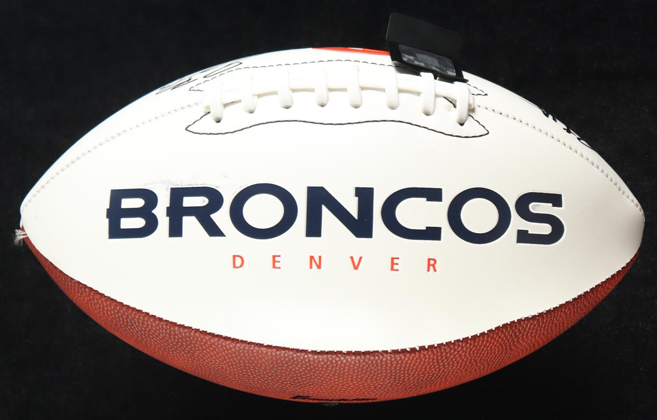 Denver Broncos logo football. Hand-signed by RJ Harvey and Pat Bryant. Please note, the signatures are smudged and there are some ink stains on the white panels. See photos for more details.