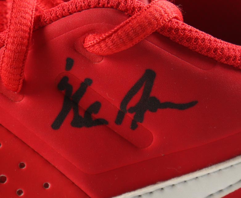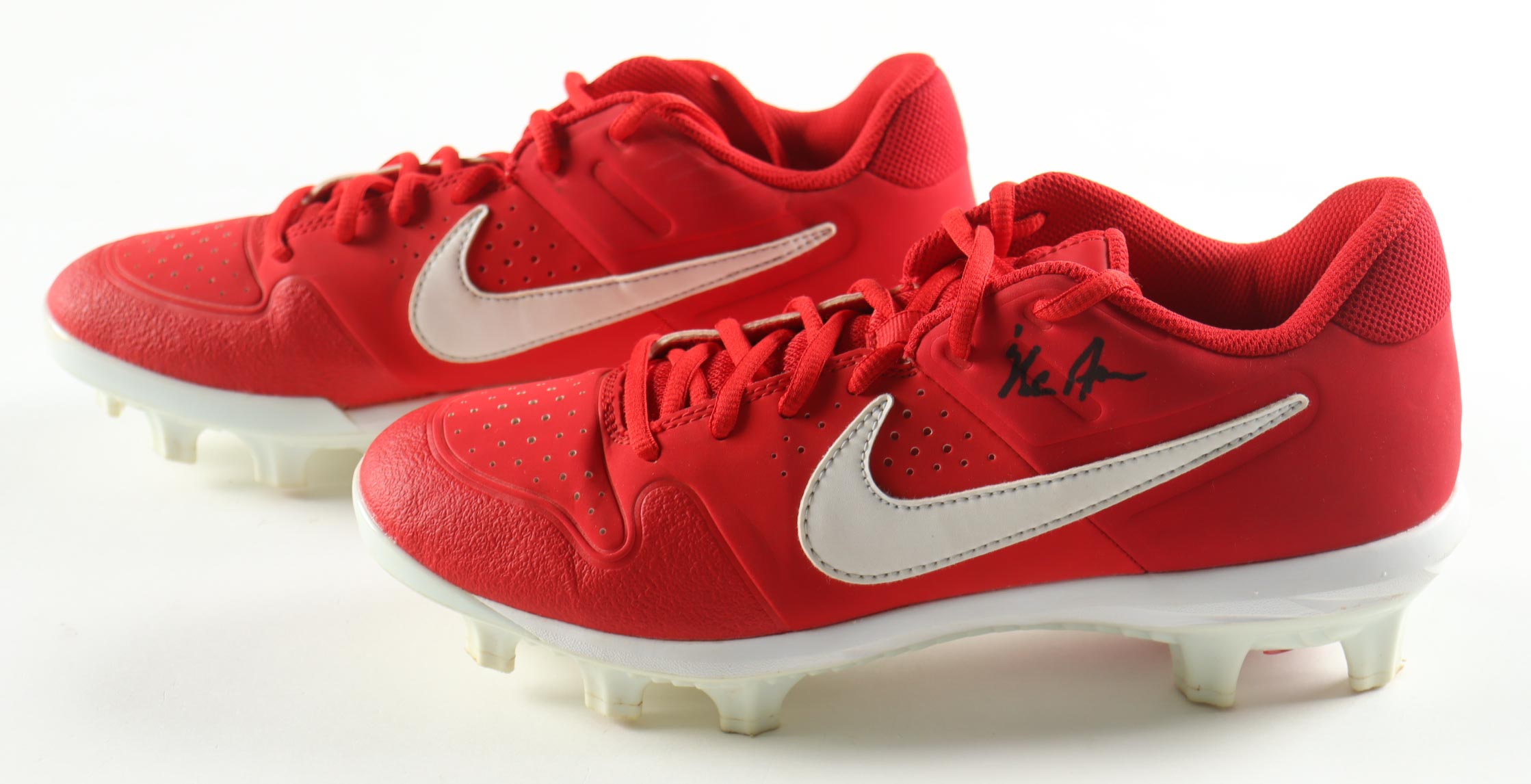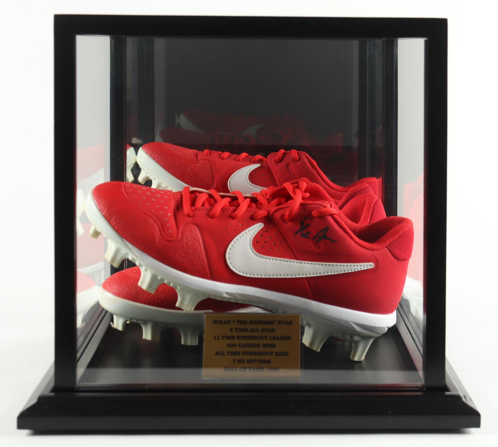 Pair of (2) Nike Alpha Huarache Red Cleats. Left cleat is hand-signed by Nolan Ryan (Texas Rangers, HOF). Display is included as shown as well as a full Nolan Ryan career statistics plaque. Please refer to photos for more details.