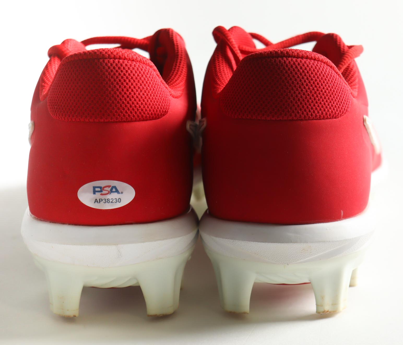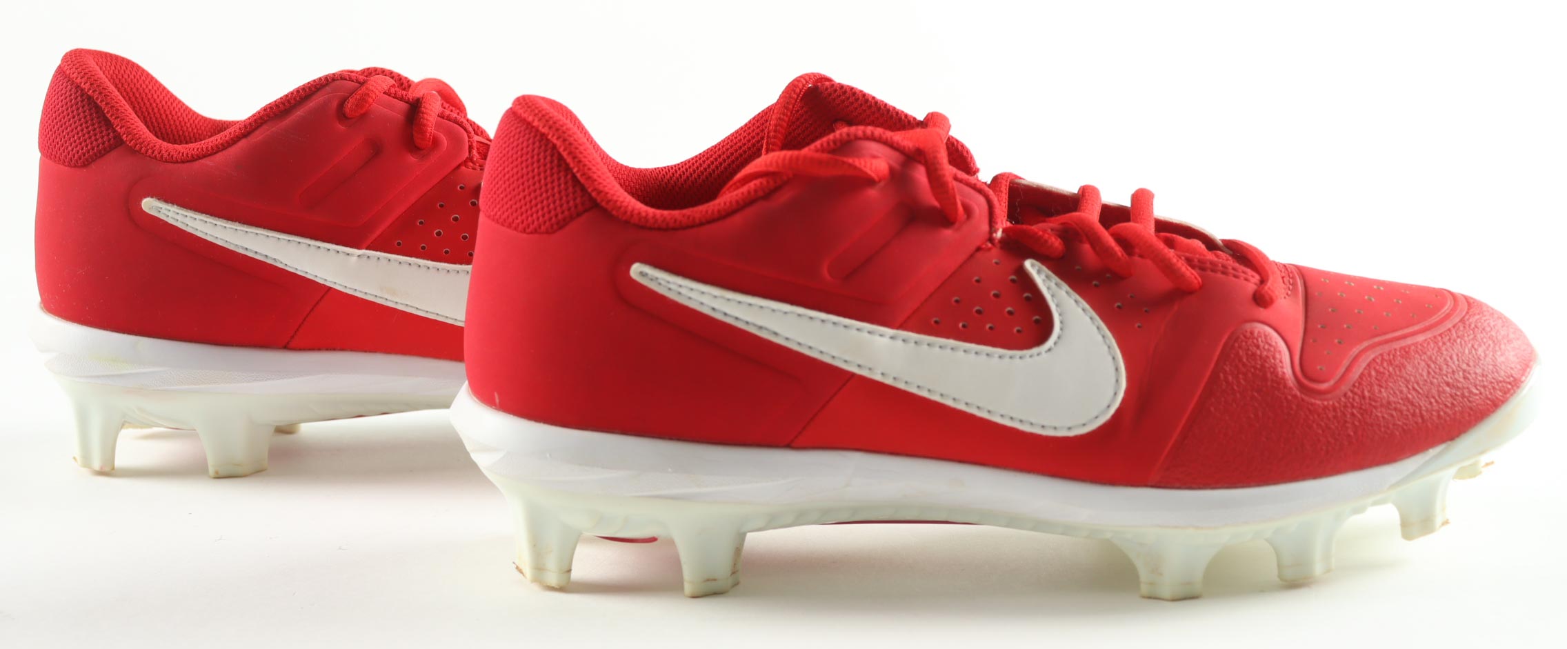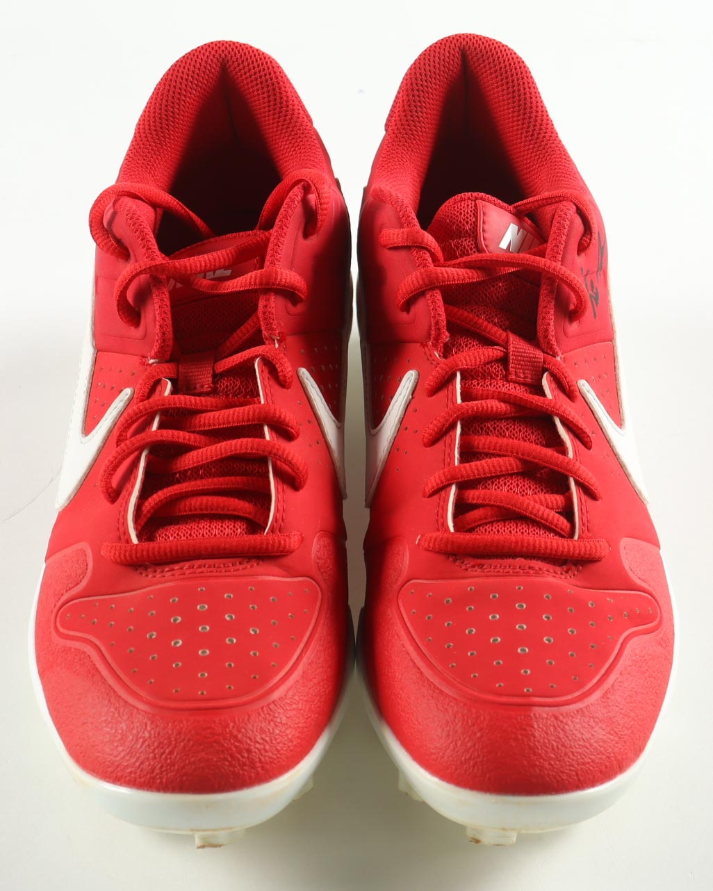Pair of (2) Nike Alpha Huarache Red Cleats. Left cleat is hand-signed by Nolan Ryan (Texas Rangers, HOF). Display is included as shown as well as a full Nolan Ryan career statistics plaque. Please refer to photos for more details.