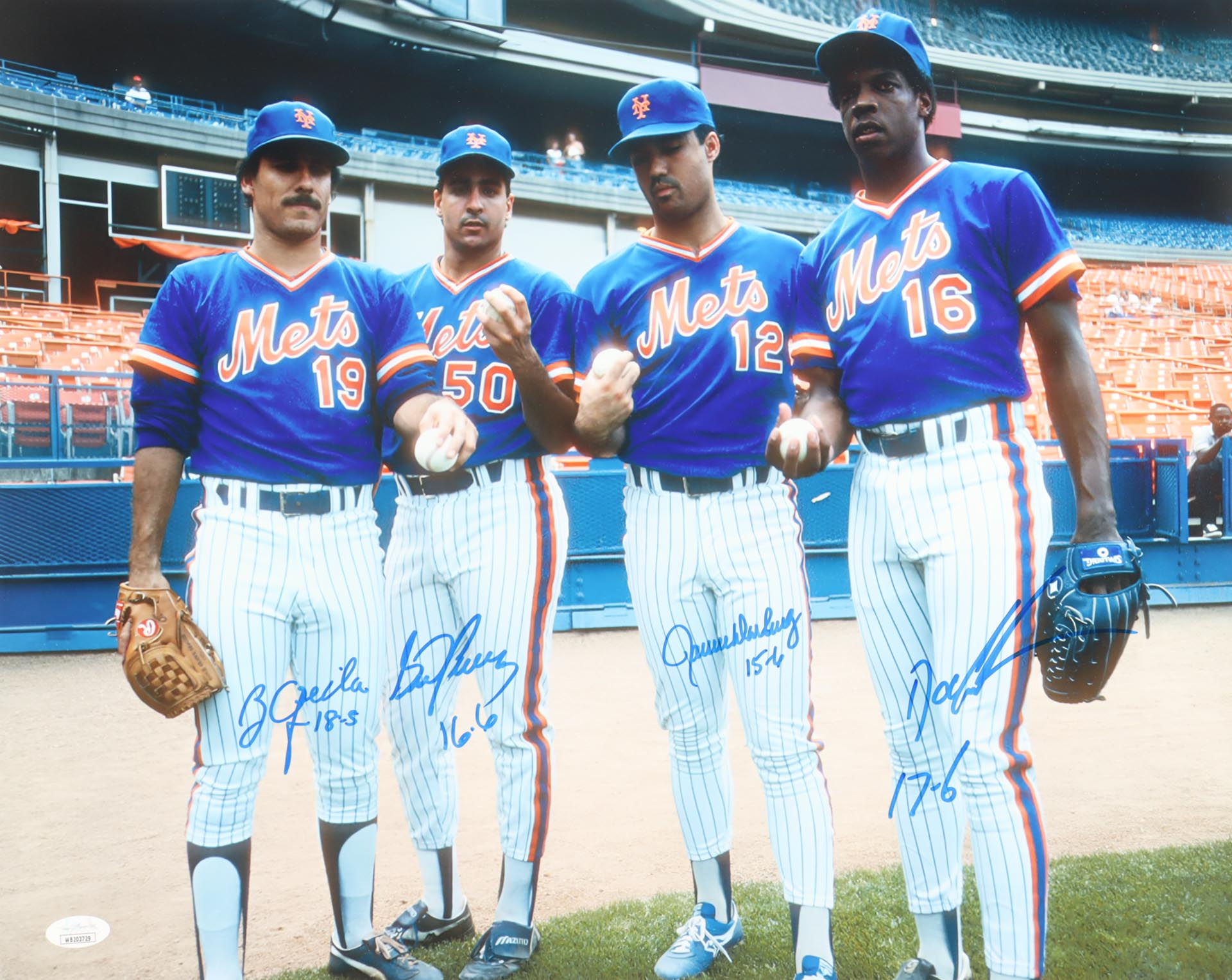 Photo measures 16" x 20" in size and has been hand-signed by Ron Darling, Bob Ojeda, Sid Fernandez and Doc Gooden. (New York Mets).