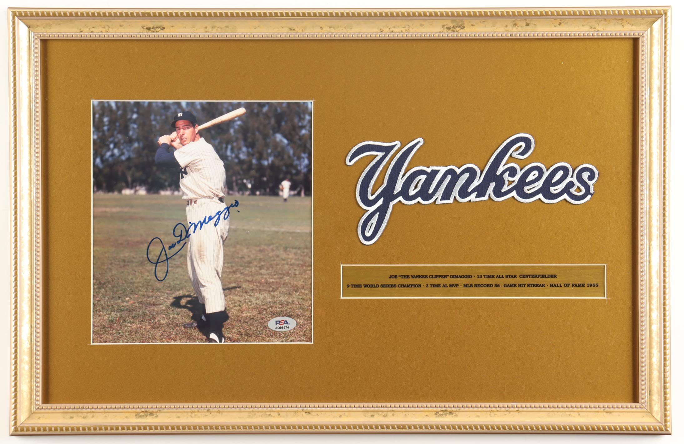 Joe DiMaggio Signed Yankees Custom Framed Photo Display with Large Yankees Uniform Patch & Full Career Statistics Plaque (PSA)
