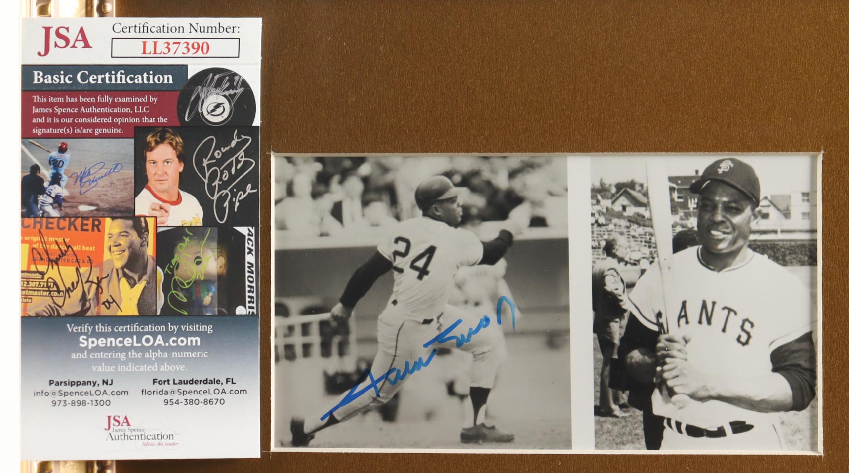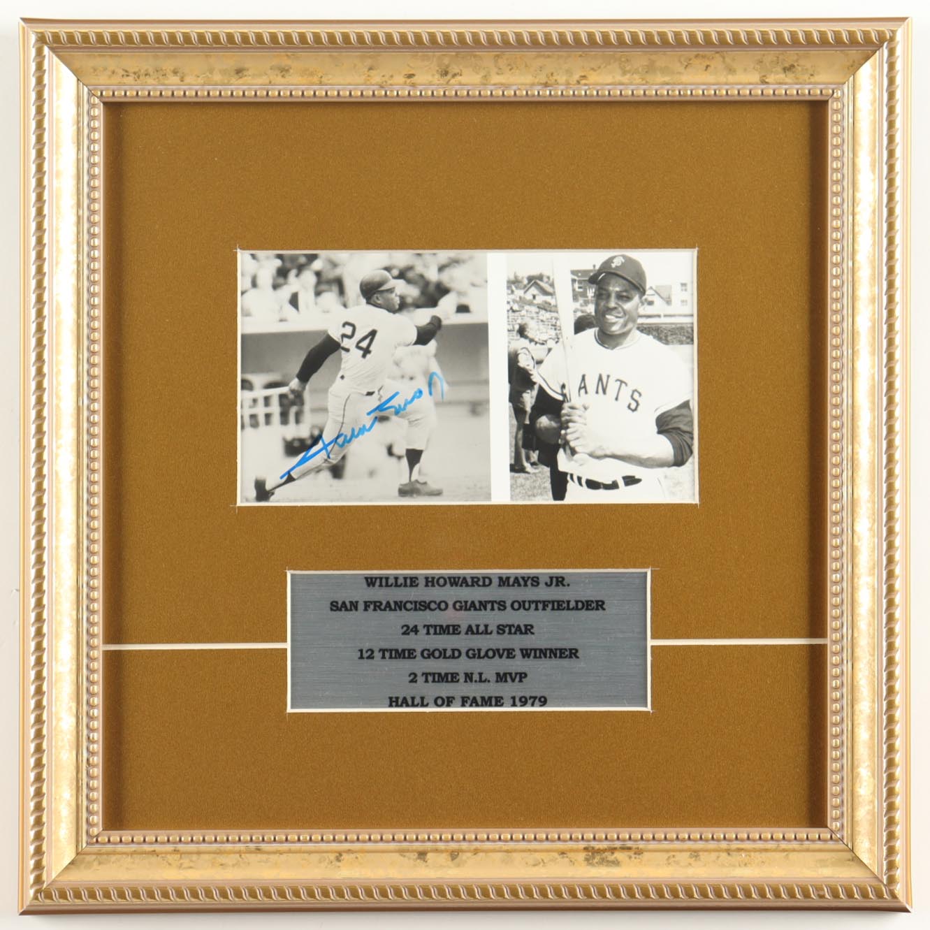Custom frame measures approximately 12" x 12" in size and features a photo that has been hand-signed by Willie Mays (D. 2024, New York Giants, HOF). Display also features a full Willie Mays career statistics plaque. Please refer to photos for more details.