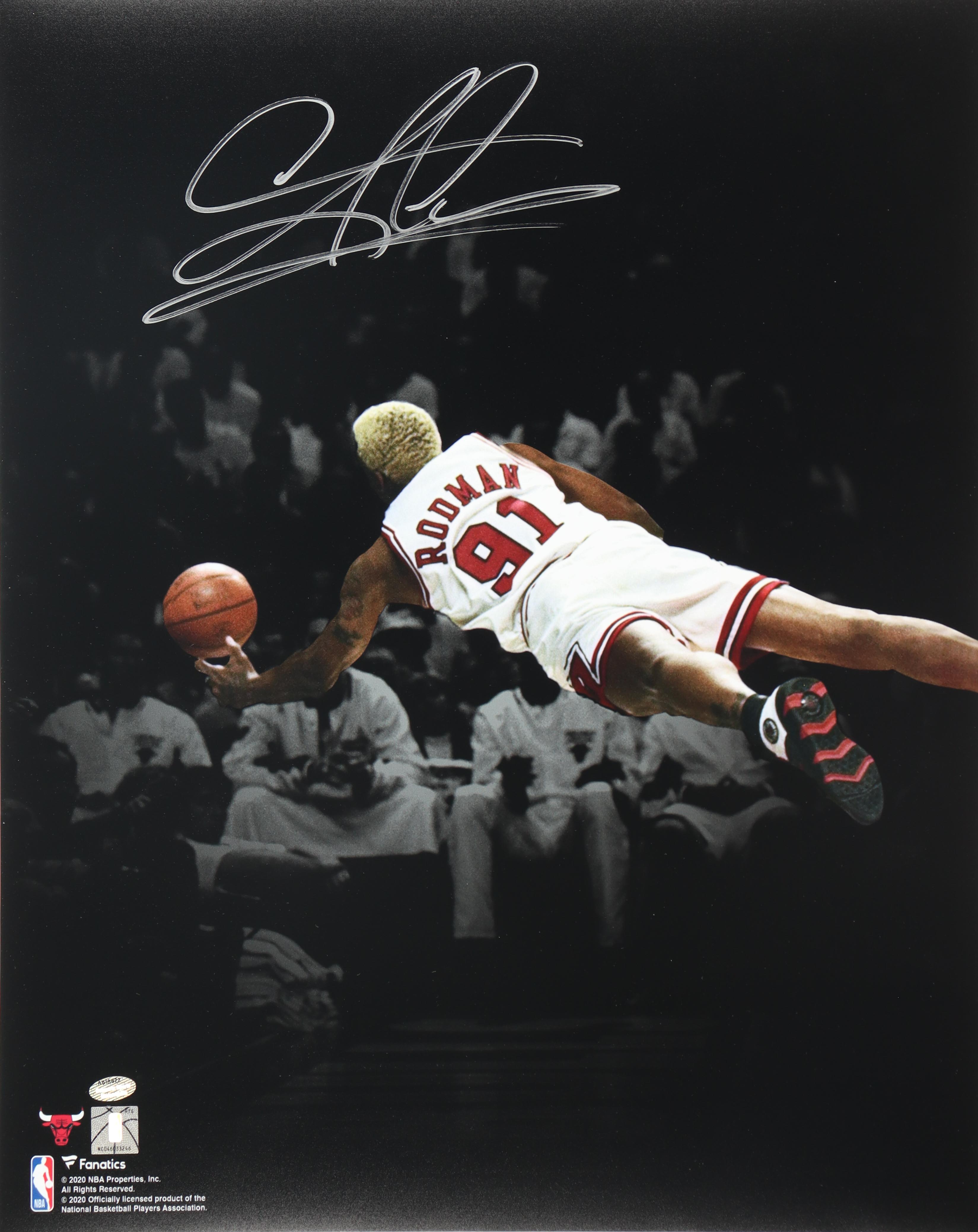 Photo measures 16" x 20" in size and has been hand-signed by Dennis Rodman (Chicago Bulls, HOF).
