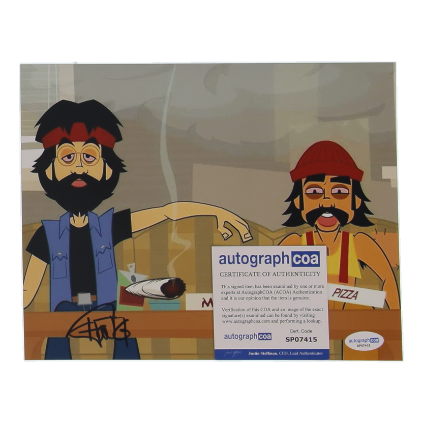 Photo measures 8" x 10" in size. Hand-signed by Tommy Chong.