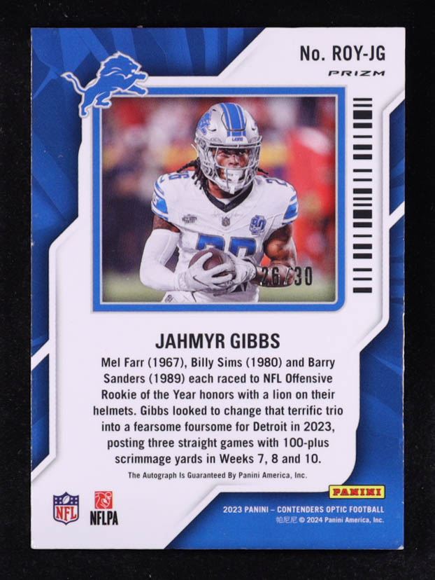 Jahmyr Gibbs 2023 Panini Contenders Optic Rookie of the Year Contenders Autographs Green Pulsar #9 #26/30