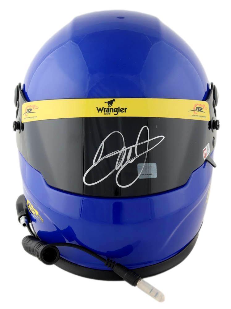 Wrangler Full-size replica NASCAR helmet is hand-signed on the visor by Dale Earnhardt Jr (HOF). Brand new display case is included.