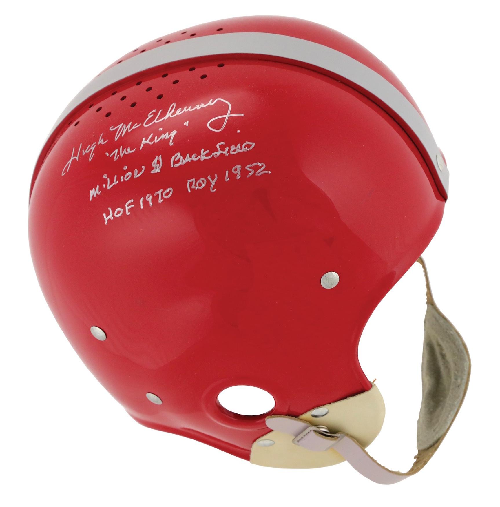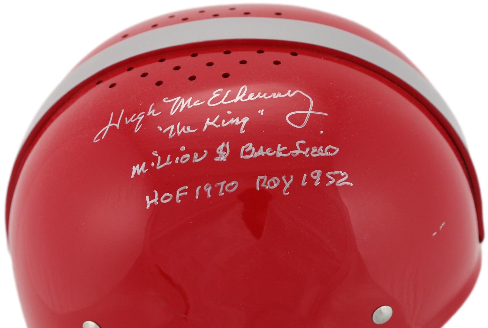Riddell Washington Huskies full-size historic suspension helmet. Hand-signed and inscribed by Hugh McElhenny (San Francisco 49ers, HOF). Brand new display case is included. Inscriptions read: