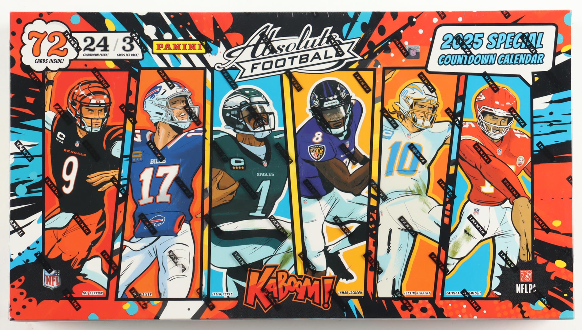 Count down to fun with 24 stunning 3-card packs behind every door! Panini presents the 2025 Absolute Football Special Countdown Calendar! Absolute Football is a venerable collecting staple that honors the top NFL stars and rookies.