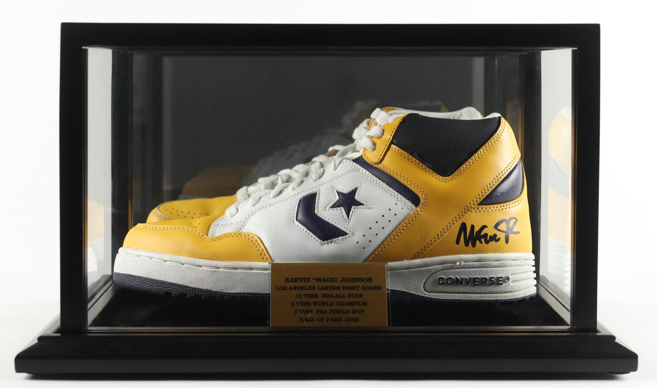 Magic Johnson Signed Converse Weapon Basketball Shoe with Display Case & Stat Plaque (Beckett)