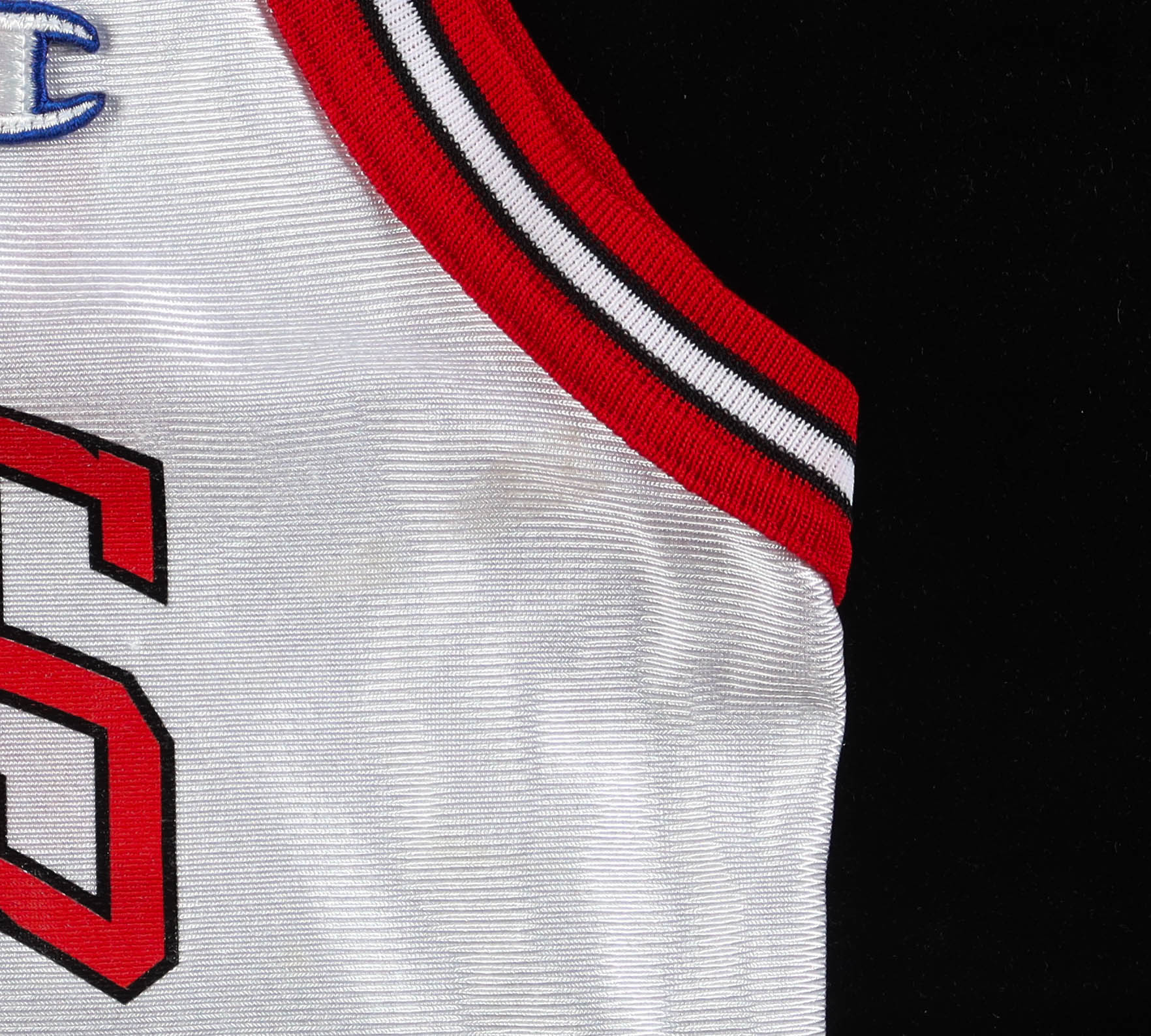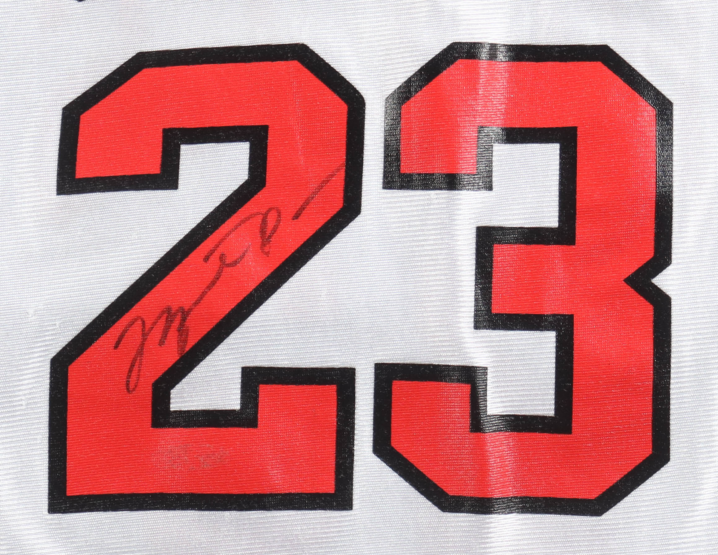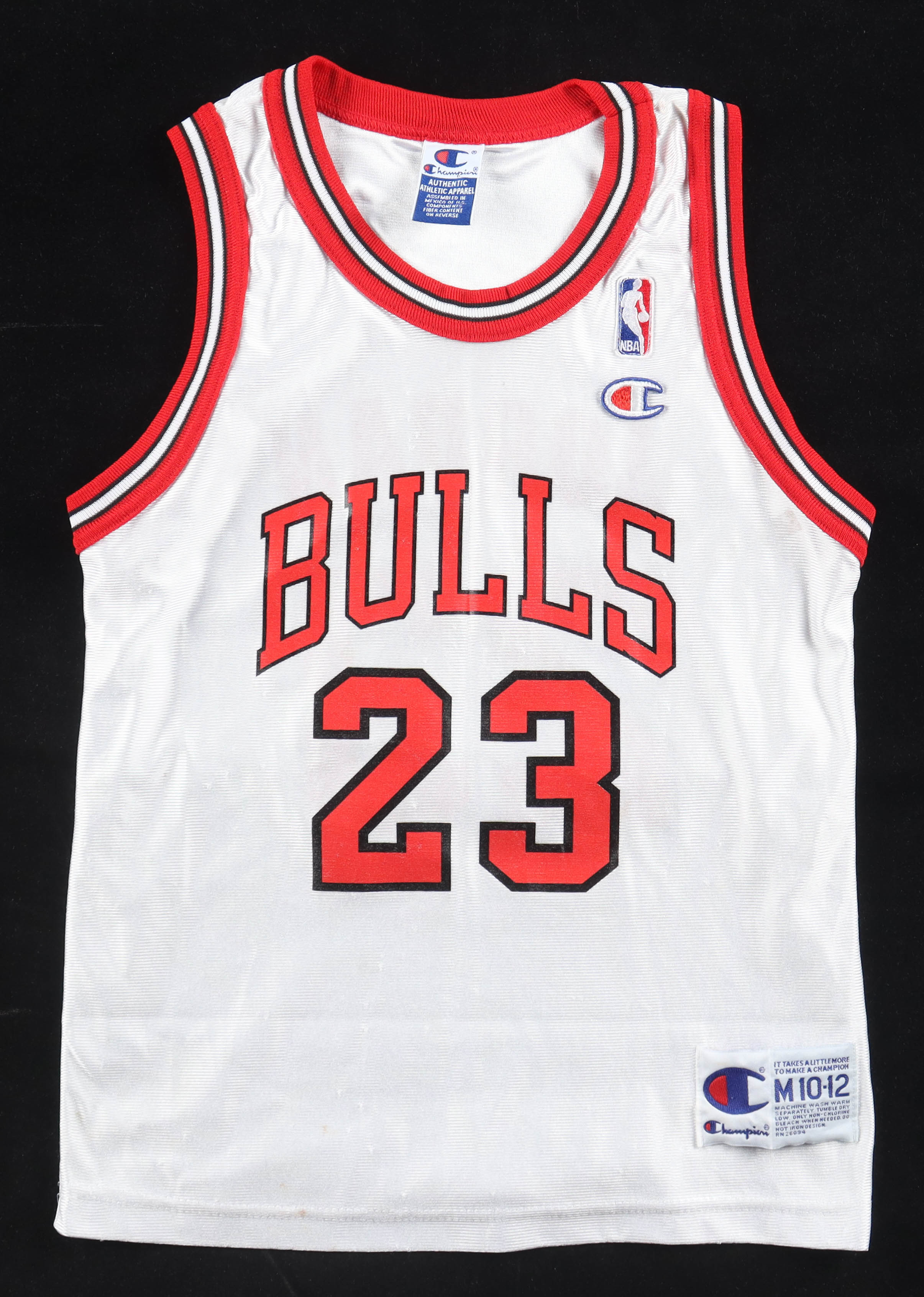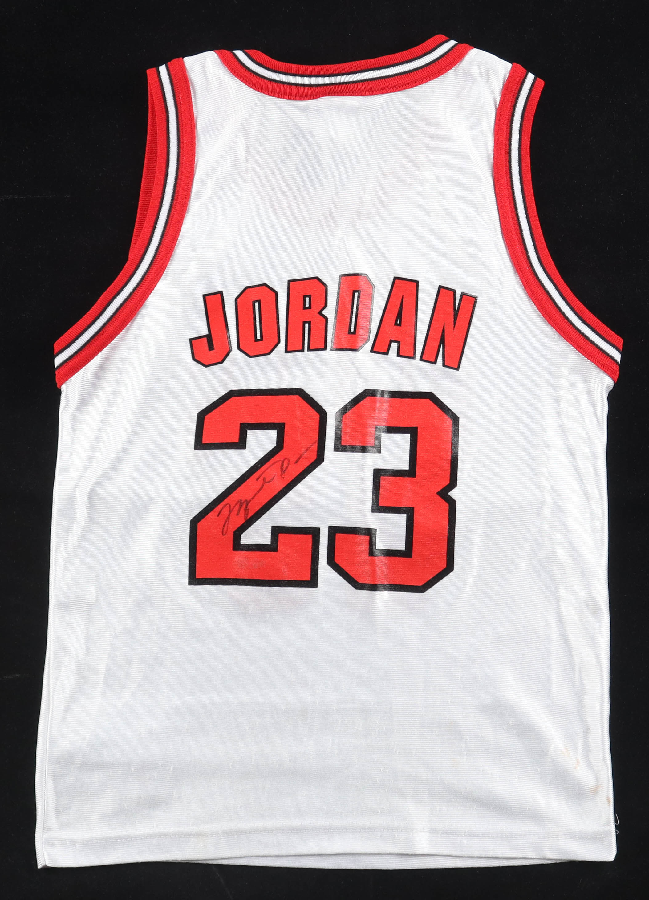 Champion authentic jersey with everything pressed on, size Youth M (Ages 10-12). Hand-signed by Michael Jordan (Chicago Bulls, HOF). Please note, the edges of the jersey are stained. See photos for more detail regarding the condition of the item.