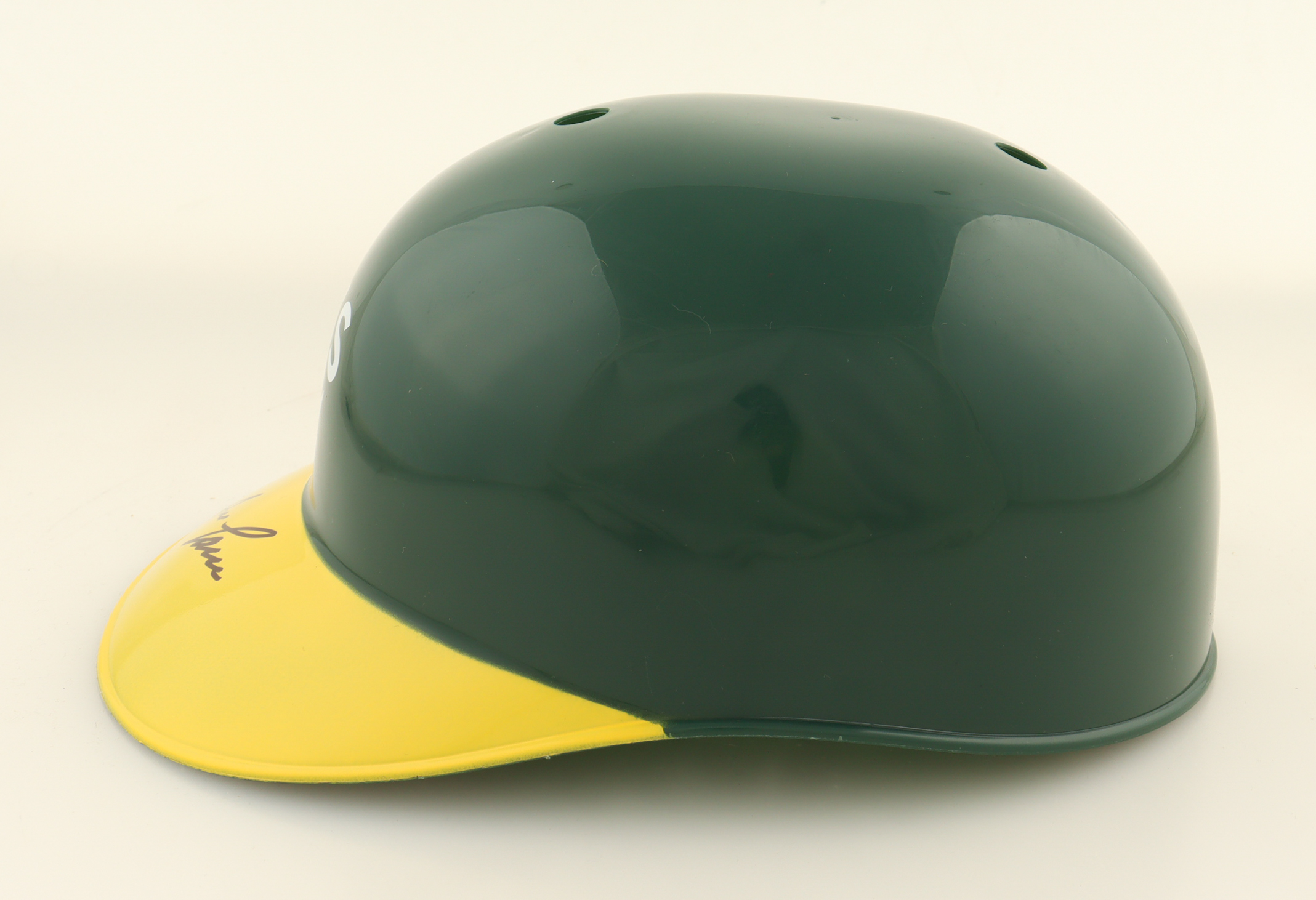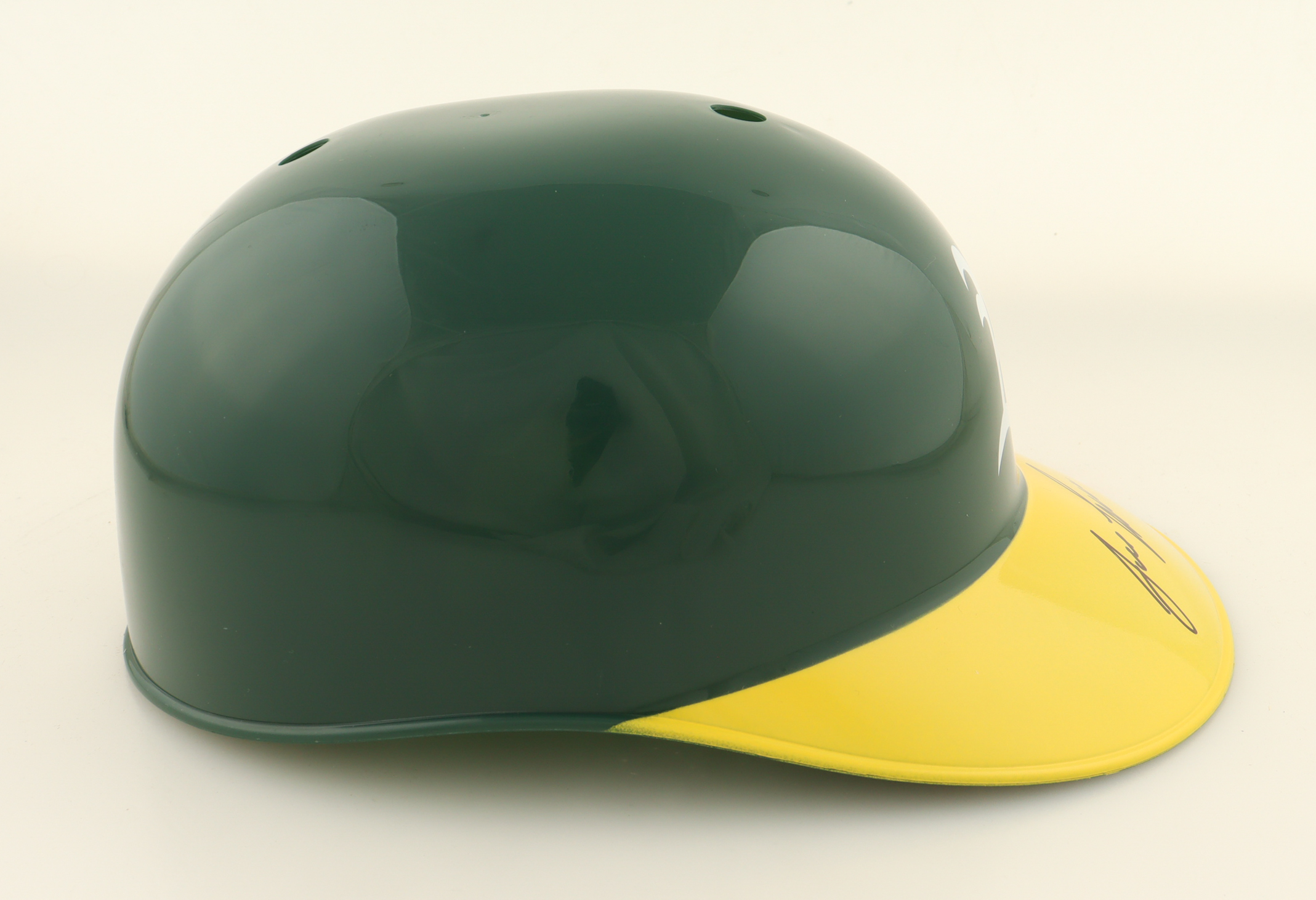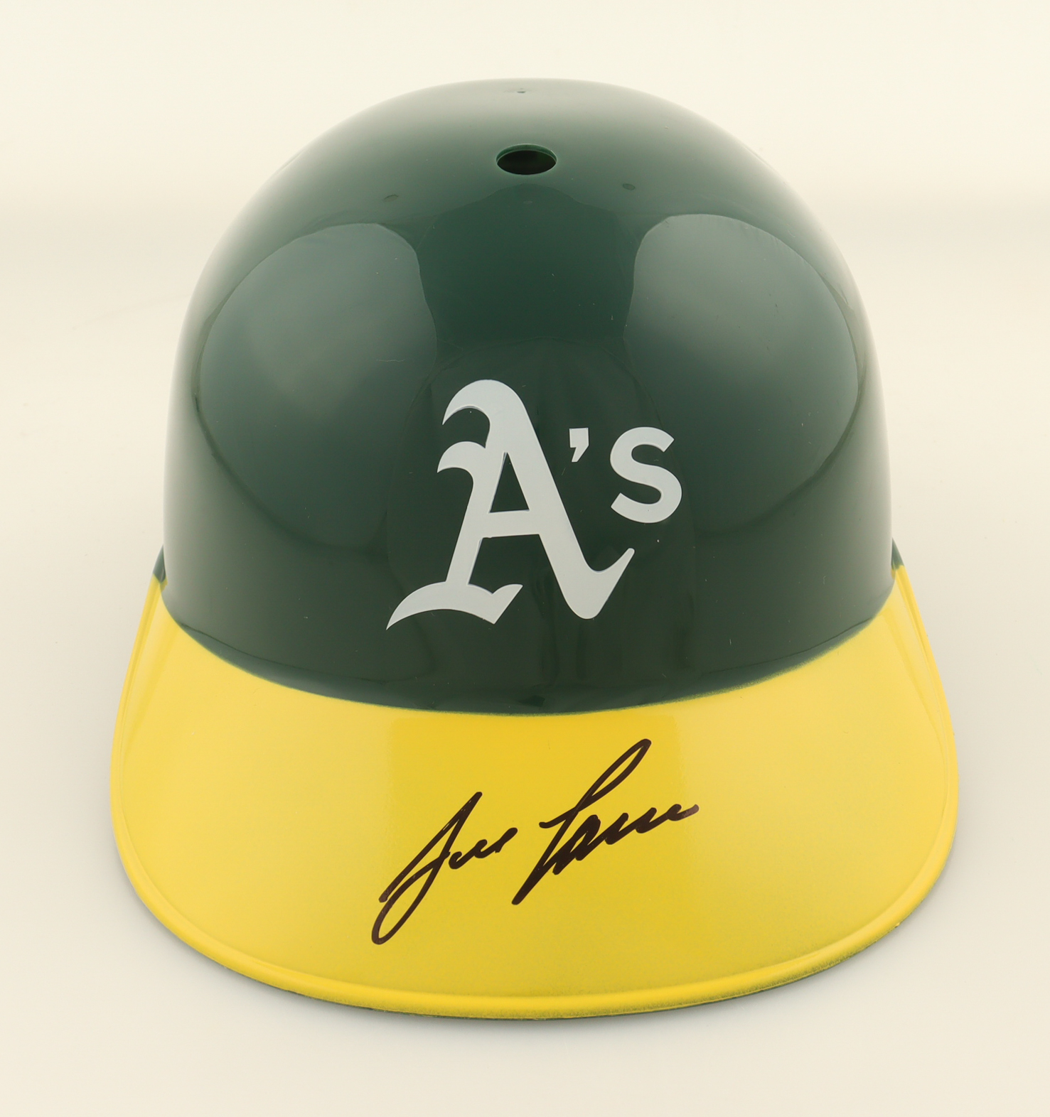 Oakland Athletics full-size replica plastic souvenir batting helmet. Helmet has been hand-signed by Jose Canseco.