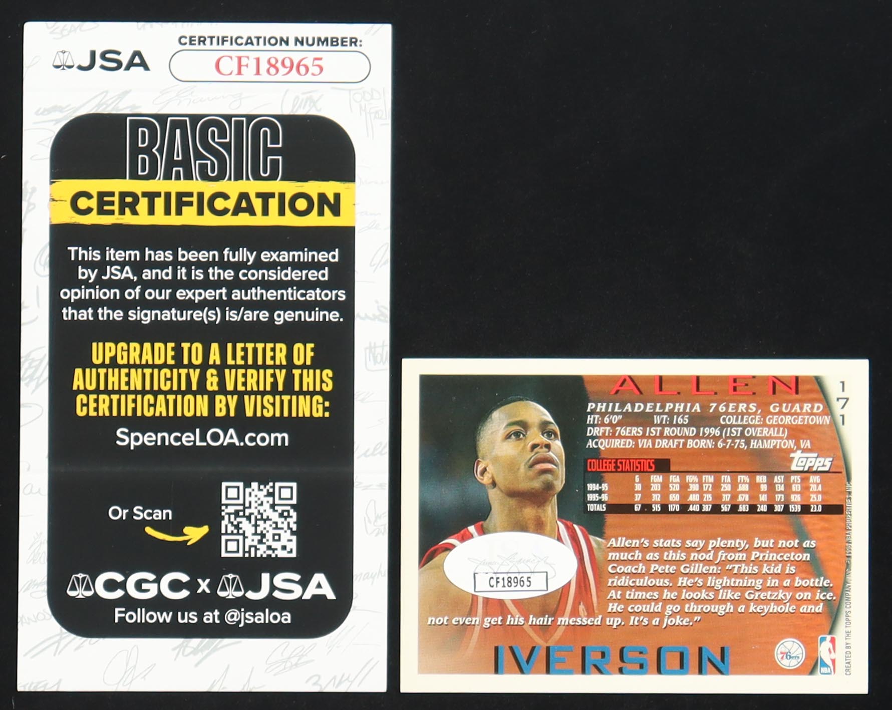 Allen Iverson Signed 1996-97 Topps #171 RC
