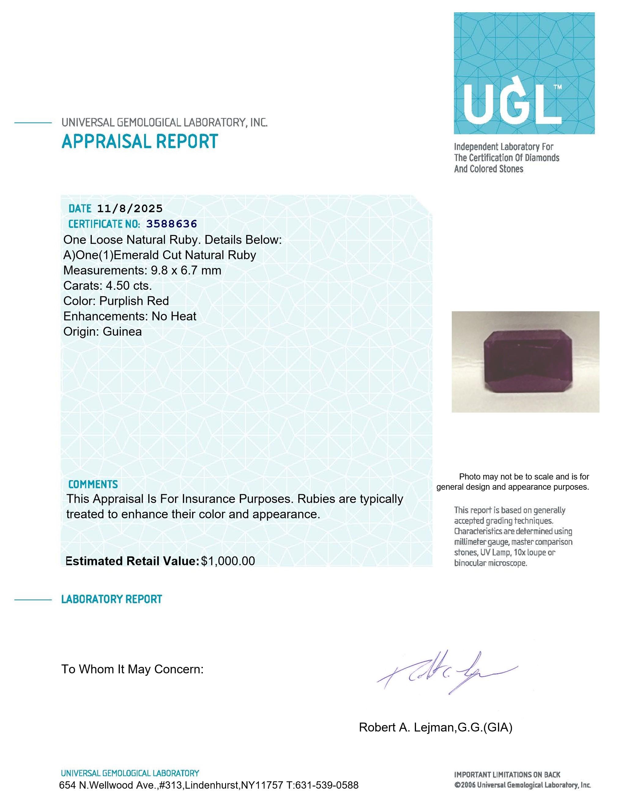 This piece includes paperwork from Universal Gemological Laboratory (UGL).
