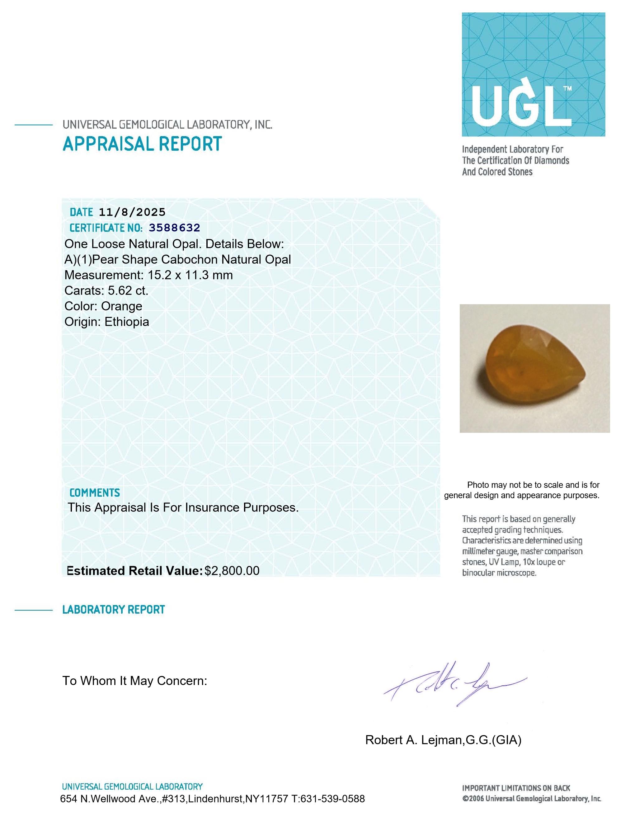 5.62 Carats Natural Orange Opal Loose | Estimated Retail Value $2,800 (UGL)
